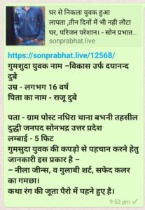 बभनी। थाना क्षेत्र अंतर्गत नधिरा निवासी राजू पाण्डेय के पुत्र विकास उर्फ दयानन्द तीन दिन से गुस्सा होकर घर से लापता थे जिन्हें परिजनों द्वारा अपने दोस्त, रिश्तेदार सहित काफी जगहों पर नही मिलने के बाद मीडिया का सहारा पीड़ित ने लिया था।