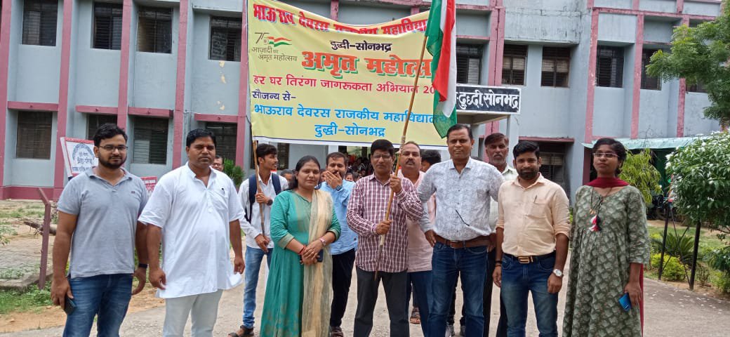दुद्धी, सोनभद्र। शासन के निर्देश के क्रम में भाउराव देवरस राजकीय स्नातकोत्तर महाविद्यालय के प्रभारी प्राचार्य डॉ. रामसेवक सिंह यादव के निर्देशन में आजादी के 75 वें अमृत महोत्सव के तत्वावधान में हर घर तिरंगा यात्रा के तहत रैली निकाली गई।हर घर तिरंगा कार्यक्रम की संयोजक श्रीमती आरजू सिंह और सह – संयोजक डॉ.बृजेश कुमार यादव के मार्गदर्शन में रैली महाविद्यालय के मुख्य द्वार से होती हुई दुद्धी नगर और मल्देवा ग्राम में जागरूकता फैलाती हुई महाविद्यालय वापस आई।