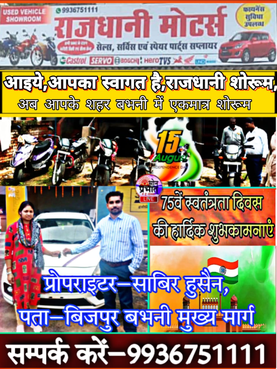 आइये, आपका स्वागत है, राजधानी शोरूम, अब आपके शहर बभनी में एकमात्र शोरूम की ओर से 75वें स्वतंत्रता दिवस की हार्दिक शुभकामनाएं।