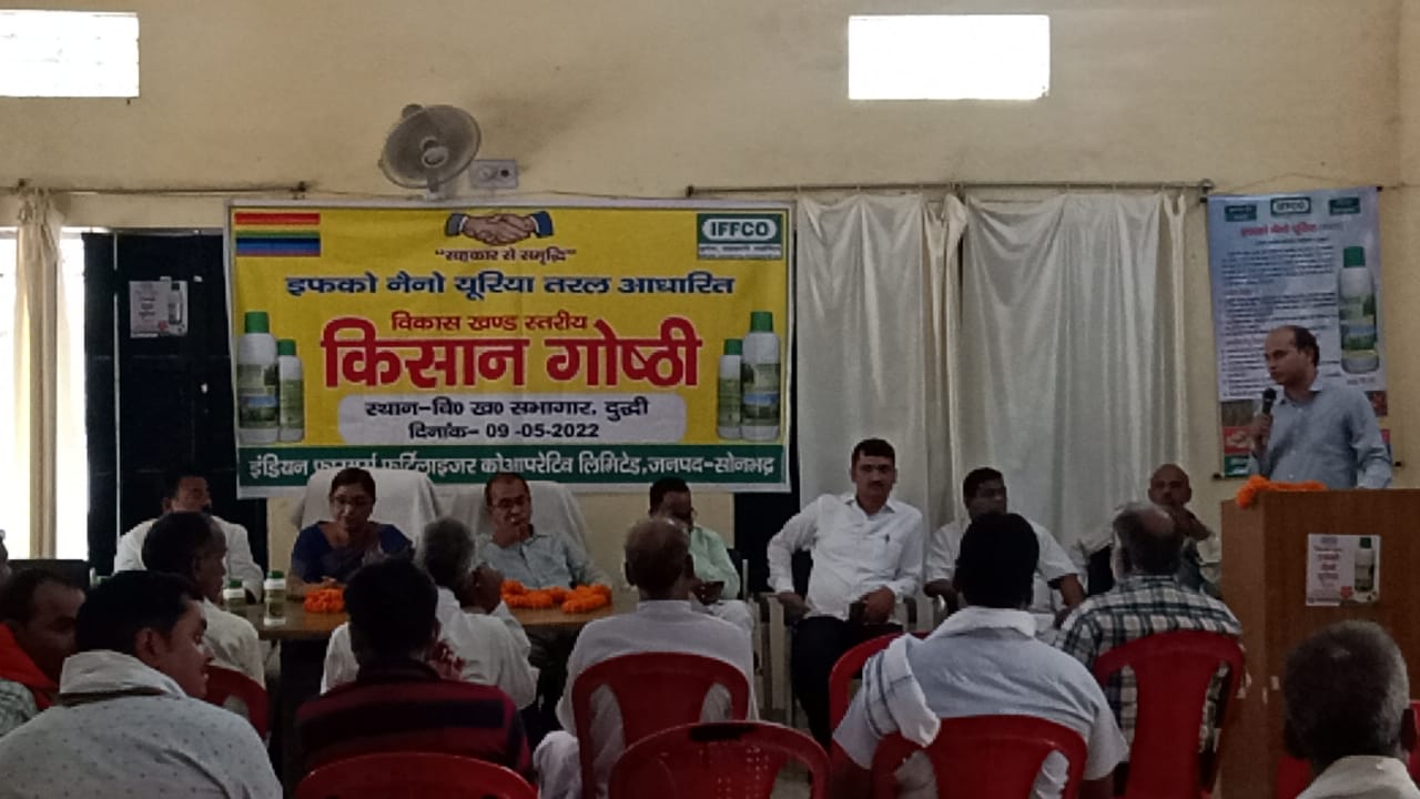दुद्धी सोनभद्र अत्याधुनिक इफको नैनो यूरिया (तरल)तकनीक पर आधारित गुणवत्ता युक्त, उर्वरक क्षमता में दक्ष, सभी फसलों के लिए पर्यावरण के लिए अनुकूल समृद्ध अन्नदाता( किसान) के उत्तरोत्तर प्रगति के सरकार की मंशाअनुसार ब्लॉक सभागार विकासखंड दुद्धी में सहकार से समृद्ध अन्नदाता बने इसके लिए किसान गोष्ठी का आयोजन किया गया।