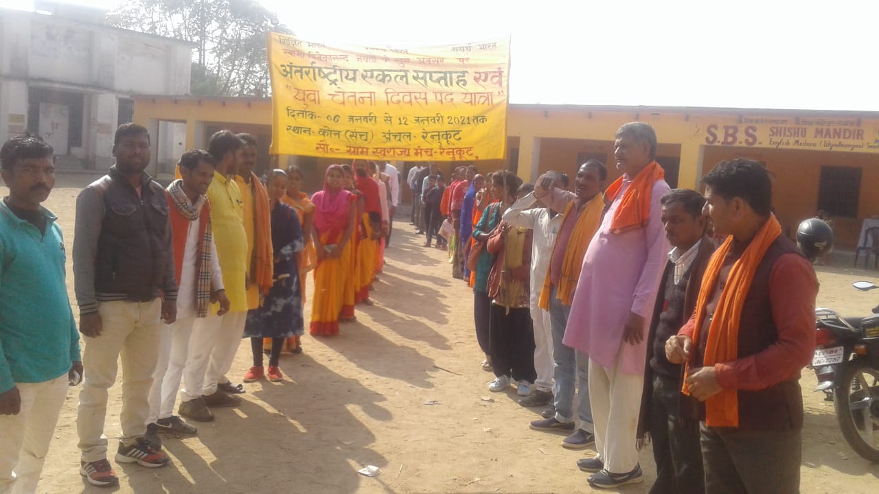 विंढमगंज ,सोनभद्र- स्थानीय थाना क्षेत्र में आज मां वैष्णो धर्मशाला के प्रांगण से अंतर्राष्ट्रीय एकल सप्ताह व स्वामी विवेकानंद जयंती पर जन जागरण पदयात्रा रांची रीवा राष्ट्रीय राजमार्ग से होते हुए झारखंड बॉर्डर तक किया गया इस मौके पर अभियान प्रमुख अरविंद कुमार ने पदयात्रा के दौरान लोगों को जागृत कर रहे थे कि जिस तरह स्वामी विवेकानंद अपनी छवि देश में ही नहीं विदेश में भी बनाए तथा अपना झंडा लहराए उन्हीं के द्वारा बताए गए आचरण पर हम सभी लोग को एकजुट होकर के गांव-गांव में सत्संग, संस्कार, मर्यादा पुरुषोत्तम श्री राम के आचरण व उनके कर्तव्यों को अपने जीवन में आत्मसाध करके आगे बढ़ेंगे।