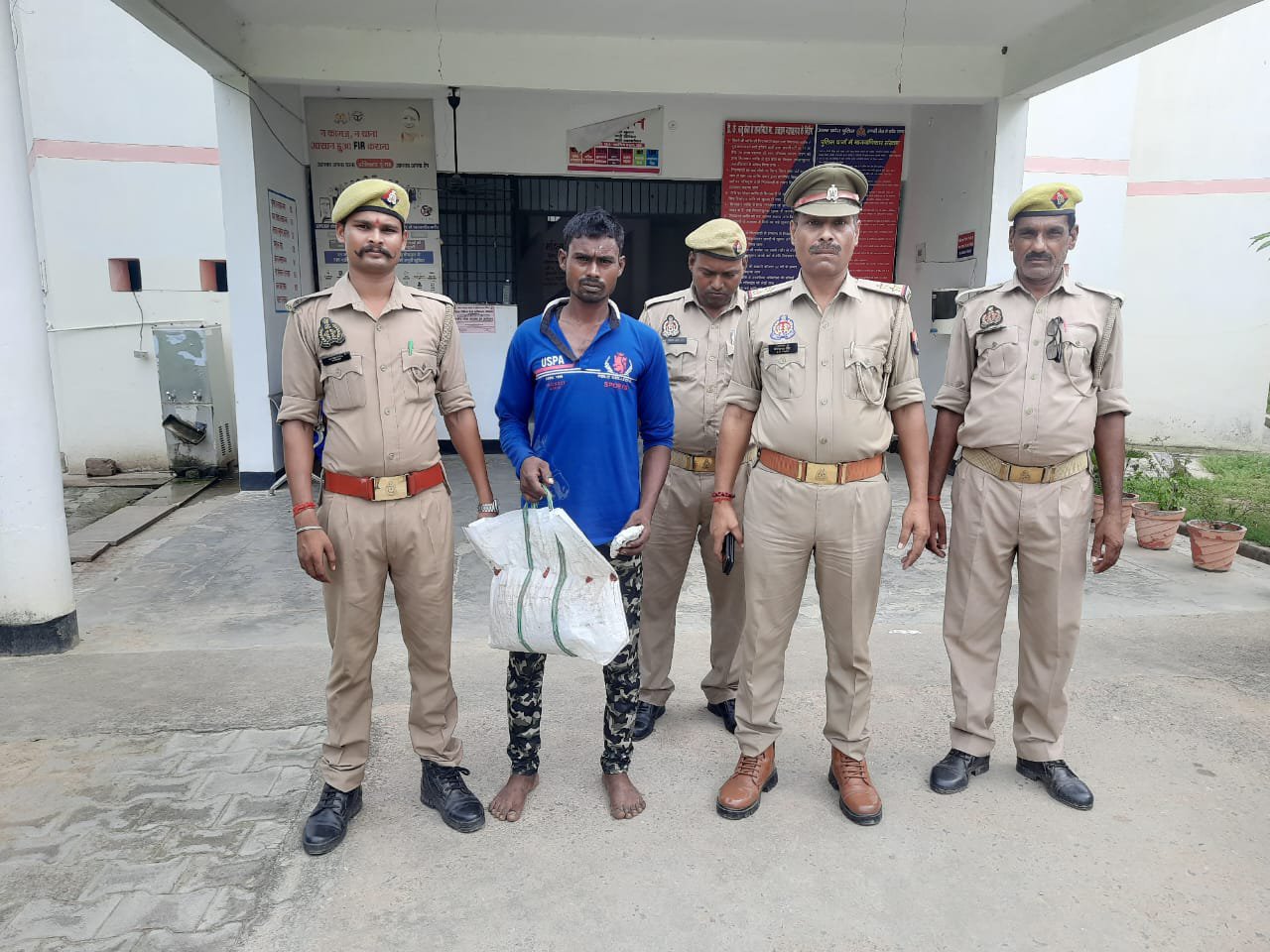 डाला सोनभद्र । पुलिस अधीक्षक महोदय के निर्देशन एवं अपर पुलिस अधीक्षक मुख्यालय व क्षेत्राधिकारी नगर महोदय के पर्यवेक्षण तथा प्रभारी निरीक्षक चोपन के कुशल नेतृत्व में अपराध एवं अपराधियों व मादक पदार्थों पर प्रभावी अंकुश लगाये जाने हेतु चलाये जा रहे अभियान के अन्तर्गत चोपन पुलिस द्वारा आज सुबह 06.30 बजे पतेरी टोला चौराहा डाला से 01 किलो 450 ग्राम नाजायज गांजा के साथ एक अभियुक्त को अन्तर्गत धारा 8/20 NDPS Act में गिरफ्तार किया गया तथा माननीय न्यायालय भेजा दिया गया गिरफ्तार अभियुक्त छोटू पुत्र शंकर राजभर निवासी चूड़ी गली डाला उम्र करीब 32 वर्ष