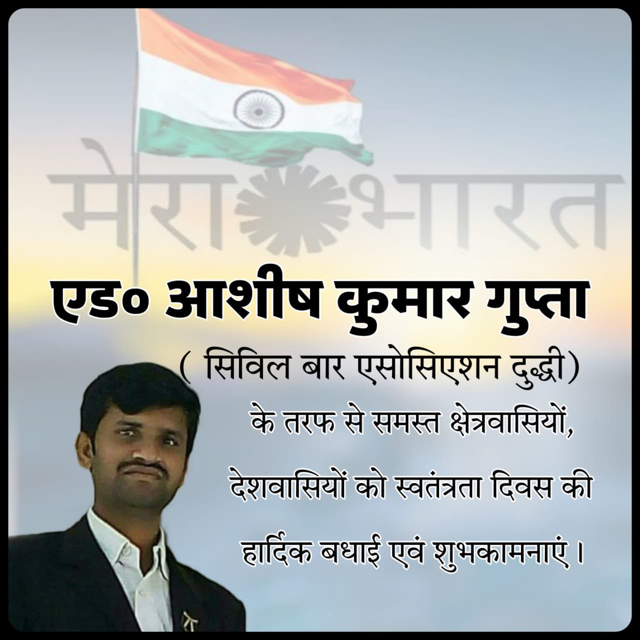 एड० आशीष कुमार गुप्ता ( सिविल बार एसोसिएशन दुद्धी) के तरफ से समस्त क्षेत्रवासियों, देशवासियों को स्वतंत्रता दिवस की हार्दिक बधाई एवं शुभकामनाएं।