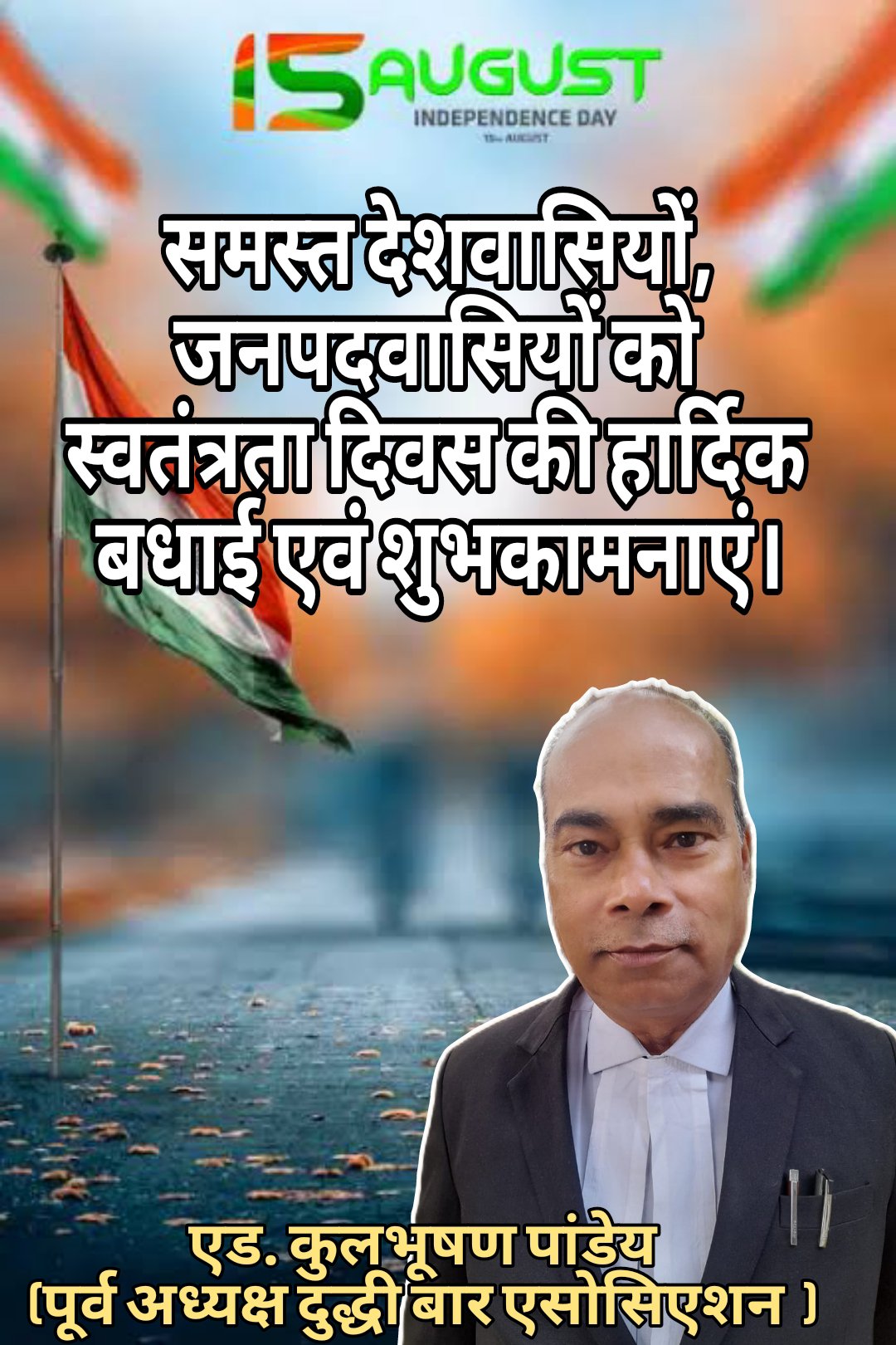 एड. कुलभूषण पांडेय (दुद्धी एसोसिएशन पूर्व अध्यक्ष दुद्धी सोनभद्र) के तरफ से समस्त देशवासियों जनपदवासियों को स्वतंत्रता दिवस की हार्दिक बधाई एवं शुभकामनाएं।