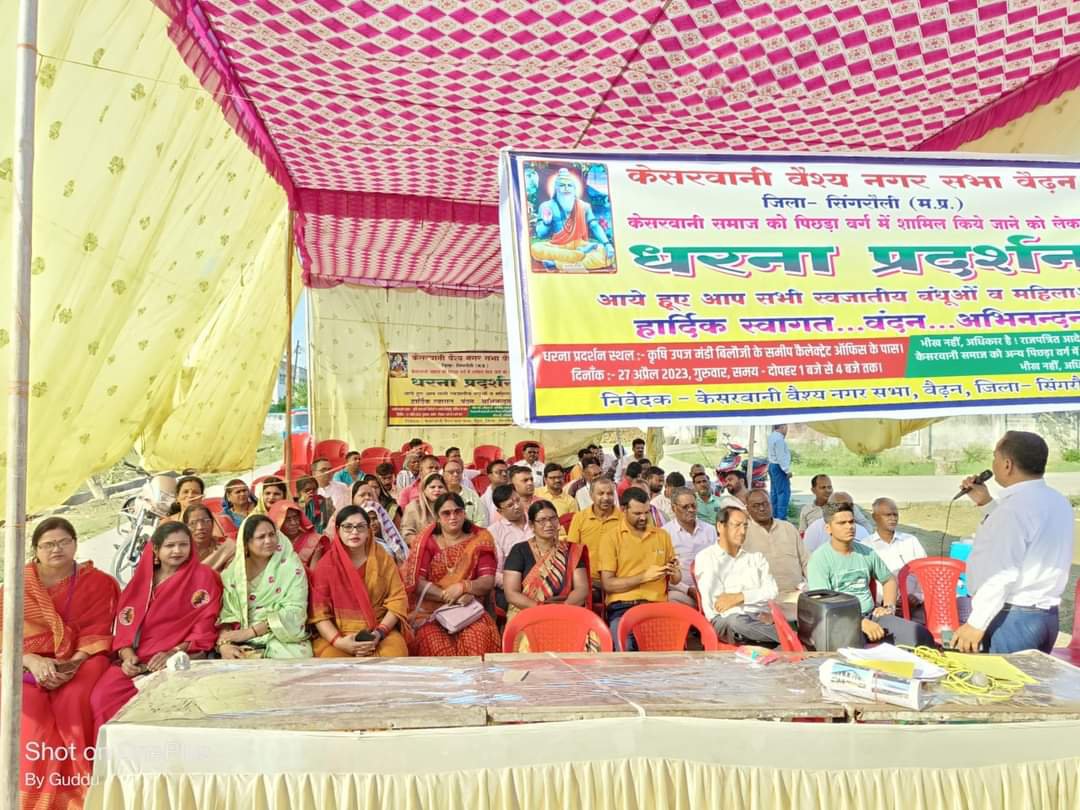 केसरवानी वैश्य नगर सभा बैढ़न जिला सिंगरौली के तत्वाधान में केसरवानी वैश्य समाज को पिछड़ा वर्ग में शामिल किए जाने को लेकर प्रदेश इकाई के आह्वान पर समस्त जिला, तहसील एवं नगर इकाई में दिनांक 27 अप्रैल 2023 को धरना प्रदर्शन करने हेतु दोपहर 1:00 से सायं 4:00 बजे तक कार्यक्रम सुनिश्चित था ,उसी कड़ी में केसरवानी वैश्य समाज नगर इकाई बैढ़न के द्वारा कृषि उपज मंडी के सामने जिला कलेक्टर कार्यालय के समीप दोपहर 1:00 शाम 4:00 बजे तक धरना प्रदर्शन करते हुए शाम 5:00 बजे एक ज्ञापन मुख्यमंत्री के नाम जिला कलेक्टर कार्यालय जाकर डिप्टी कलेक्टर माइकल तिर्की के हाथों सौंपा गया।