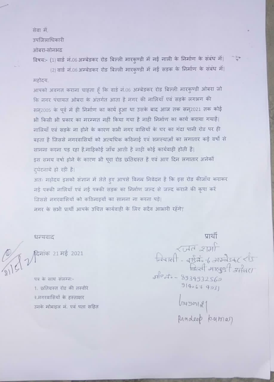 ओबरा,सोनभद्र-ओबरा के नगर वासियों ने क्षत्रिग्रस्त नाली एवं सड़क के लिए उपजिलाधिकारी को सौंपा पत्र बिल्ली मारकुण्डी अम्बेडकर रोड के निवासी रजत शर्मा के नेतृत्व में उपजिलाधिकारी को पत्र सौंपा गया एवं मुख्य रूप से कहा गया है।