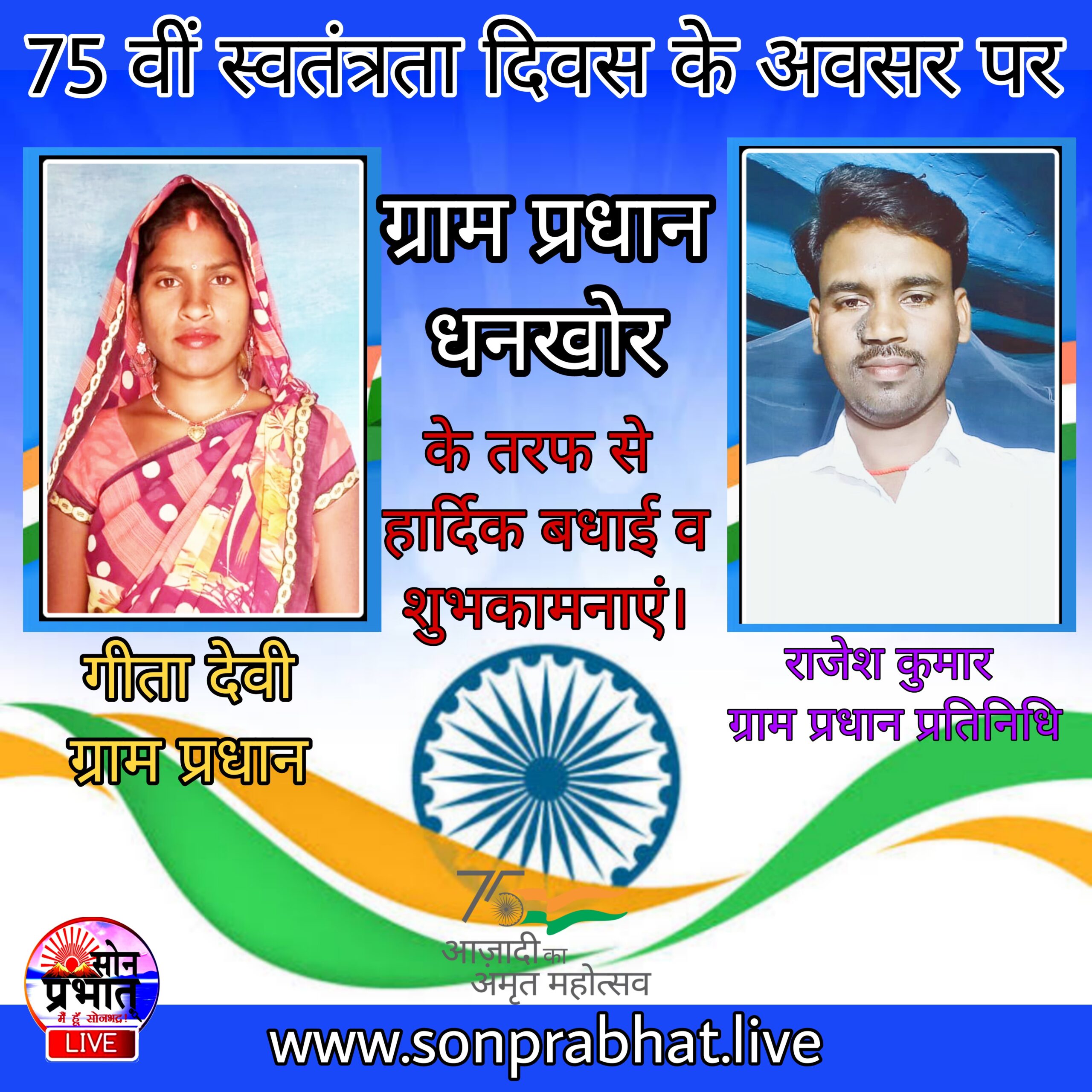 ग्राम प्रधान धनखोर गीता देवी एवं ग्राम प्रधान प्रतिनिधि राजेश कुमार ने समस्त जनपदवासियों व ग्रामवासियों को आजादी के 75वे वर्षगांठ की ढेरों शुभकामनाएं और बधाई ज्ञापित किया है।