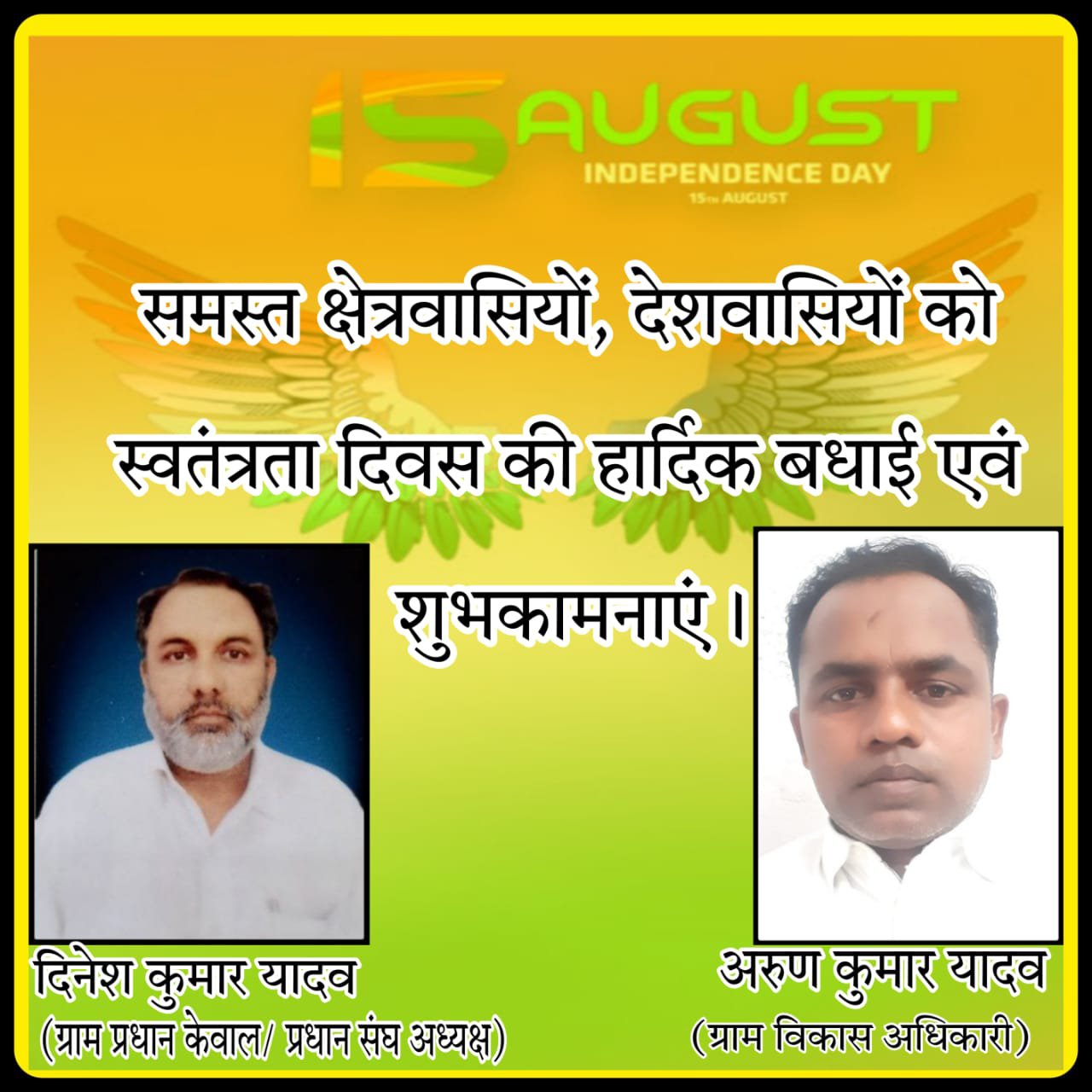 अरुण कुमार यादव (ग्राम विकास अधिकारी) व दिनेश कुमार यादव (ग्राम प्रधान केवाल/ प्रधान संघ अध्यक्ष) दुद्धी सोनभद्र के तरफ से समस्त क्षेत्रवासियों, देशवासियों को स्वतंत्रता दिवस की हार्दिक बधाई एवं शुभकामनाएं ।