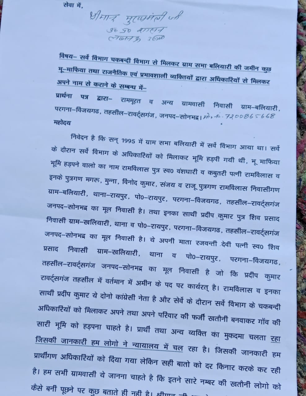 सोनभद्र जनपद के रायपुर थाना क्षेत्र अंतर्गत नगवां ब्लॉक के बलियारी गांव से एक सनसनीखेज मामला सामने आया है, जहां सर्वे और चकबंदी विभाग की मिलीभगत से भू-माफियाओं ने नियमों को ताक पर रखकर गरीबों की 25 बीघा ग्राम समाज की जमीन पर कब्जा जमा लिया है।