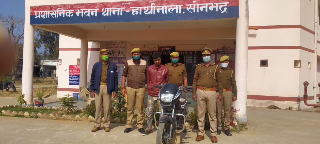 डाला सोनभद्र। पुलिस अधीक्षक सोनभद्र के निर्देशानुसार जनपद में अपराध एवं अपराधियो के विरुद्ध चलाए जा रहे अभियान के तहत आज सोमवार हाथीनाला थाना के क्षेत्र में चेकिंग के दौरान चोरी के बाइक के साथ एक युवक को गिरफ्तार कर जेल भेजा गया।