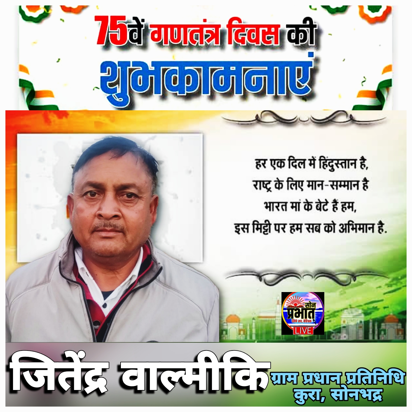 ग्राम प्रधान प्रतिनिधि कुरा सोनभद्र जितेंद्र वाल्मीकि ने गणतंत्र दिवस के अवसर पर बधाई व शुभकामनाएं ज्ञापित की है।