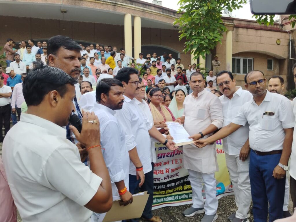 अखिल भारतीय प्राथमिक शिक्षक संघ के आहवान पर एवं उत्तर प्रदेशीय प्राथमिक शिक्षक संघ के बैनर तले जनपद शाखा सोनभद्र के जिलाध्यक्ष योगेश पाण्डेय जी के नेतृत्व में हजारों की संख्या में जिला कलेक्ट्रेट पर शिक्षक/शिक्षिकाएं उपस्थित होकर शिक्षा का अधिकार अधिनियम में संशोधन कर अधिनियम लागू होने से पूर्व नियुक्त शिक्षकों को टीईटी (T.E.T.) उत्तीर्ण होने की अनिवार्यता से मुक्त करने के संबंध में माननीय प्रधानमंत्री जी एवं माननीय मुख्यमंत्री जी को संबोधित ज्ञापन सौंपा।