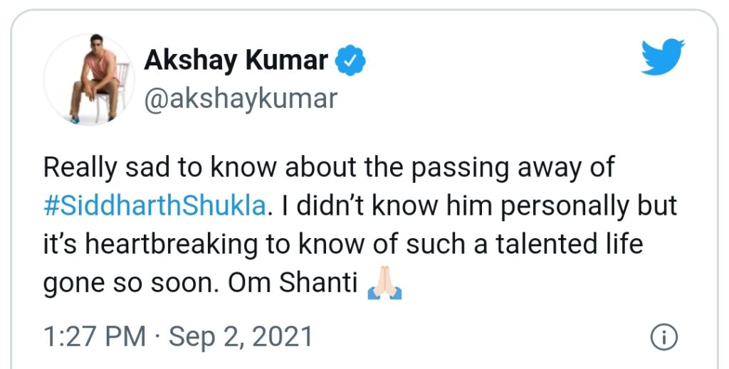 फिल्म स्टार अक्षय कुमार ट्विटर के माध्यम से अपनी संवेदना व्यक्त की।