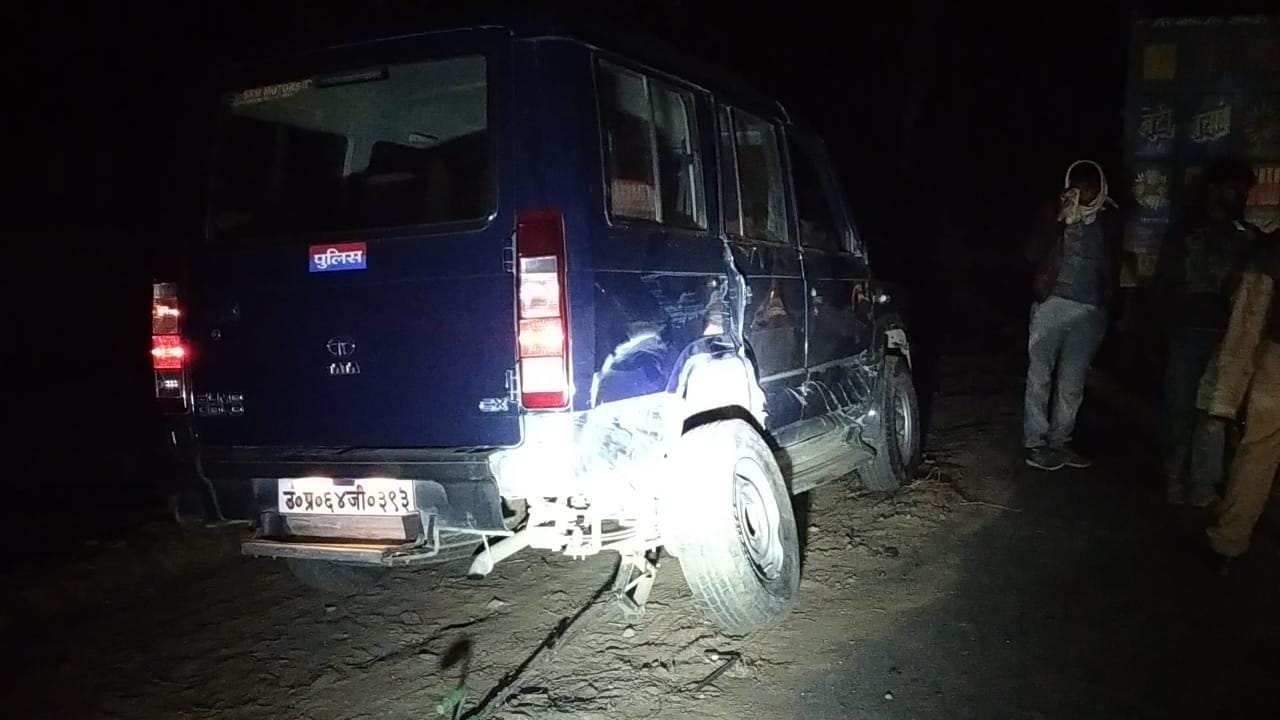 दुद्धी/ सोनभद्र| कोतवाली क्षेत्र के अंतर्गत बंद रजखड़ पेट्रोल पंप के पास रात्रि सवा 8 बजे पुलिस की गाड़ी में एक तेज रफ्तार ट्रिप र ने साइड से जोरदार टक्कर मार दी ,जिससे वाहन के चालक साइड के दोनों दरवाजे समेत पिछला टायर मौके पर भ्रस्ट्र हो गया और रिम क्षतिग्रस्त हो गया|
