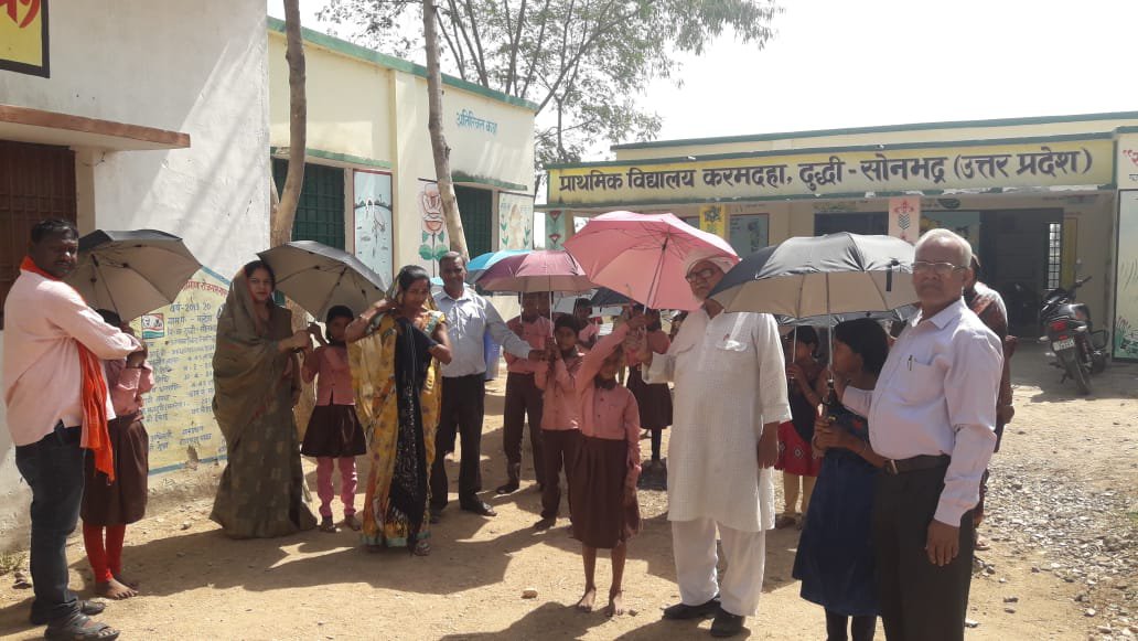 दुद्धी/ सोनभद्र| तपती धूप से नन्हे मुंहे बच्चे को बचाव करने हेतु सामाजिक कार्यकर्ता अमरनाथ जायसवाल ने आज मल्देवा गांव स्थित करमदाहा प्राथमिक विद्यालय पर बच्चों में सभी उपस्थित छात्र छात्राओं को कुल 30 पीस छाता वितरीत किया , छाता पाकर नन्हे मुंहे बच्चे प्रफुल्लित हो गए|