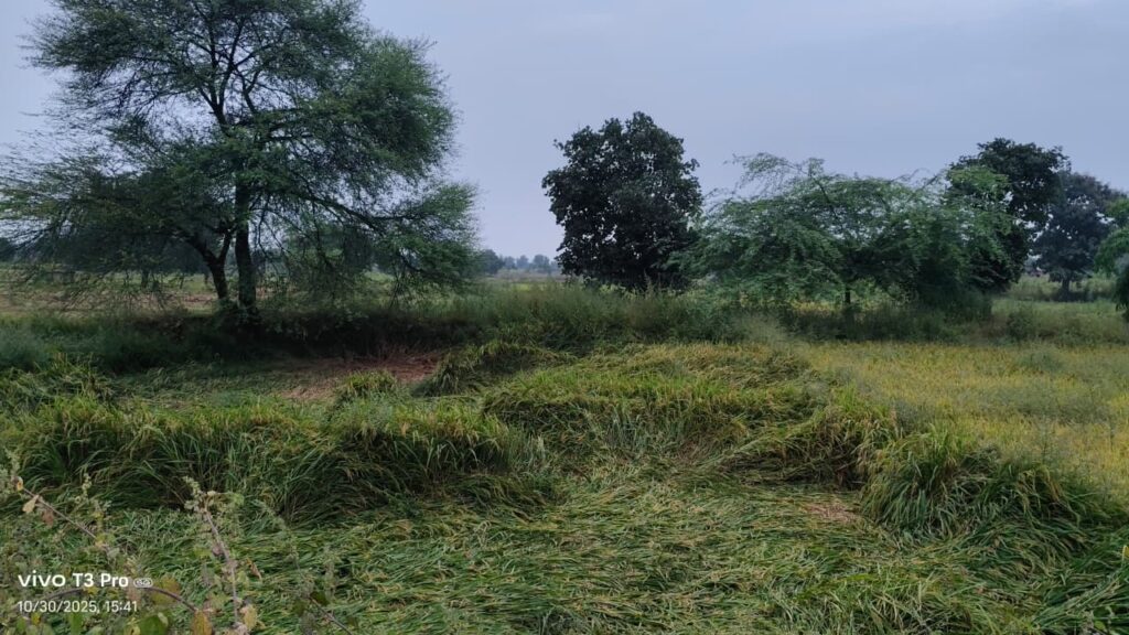 म्योरपुर विकासखंड अंतर्गत विभिन्न गाँवों में पिछले तीन दिनों से रुक-रुक कर हो रही बारिश से किसानों की धान की फसल बर्बाद हो गई है। खेतों में खड़ी धान की फसल बारिश और तेज हवा के कारण गिर गई, वहीं कई किसानों की कटी हुई फसल जो खेतों में ही छोड़ी गई थी, वह भी बारिश के पानी से भीग गई।बारिश का असर इतना अधिक रहा कि खलिहानों में रखी धान की फसल भी पानी में भीगकर खराब हो गई।