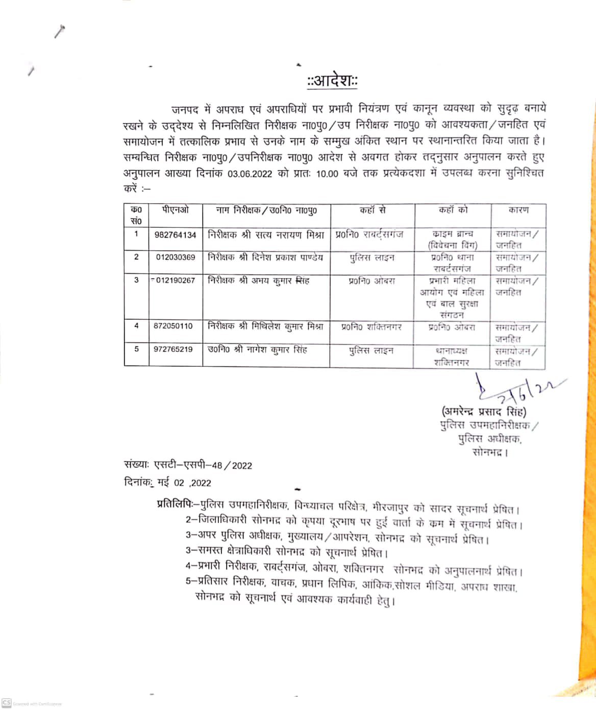 सोनभद्र जिले के पुलिस अधीक्षक अमरेन्द्र प्रताप सिंह ने कानून व्यवस्था को चुस्त दुरुस्त बनाए रखने हेतु चार प्रभारी निरीक्षकों के कार्य क्षेत्र में बदलाव किया है।रावर्ट्सगंज के प्रभारी निरीक्षक रहे सत्यनारायण मिश्रा को क्राइम ब्रांच विवेचना विंग, पुलिस लाइन में रहे दिनेश प्रकाश पाण्डेय को प्रभारी निरीक्षक रावर्ट्सगंज, प्रभारी निरीक्षक ओबरा अभय कुमार सिंह को महिला आयोग एवं बाल सुरक्षा मिथिलेश कुमार मिश्र को शक्ति नगर से प्रभारी निरीक्षक ओबरा बनाया गया है।उप निरीक्षक नागेश कुमार को पुलिस लाइन से शक्ति नगर का चार्ज दिया गया है।