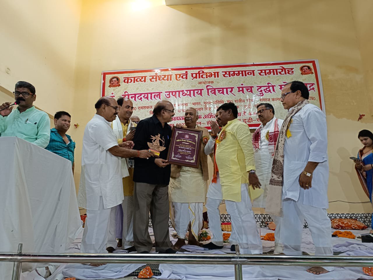 दुद्धी सोनभद्र तहसील अन्तर्गत होटल ग्रीन स्टार दुद्धी में सोमवार की शाम एकात्म मानववाद व अंत्योदय के प्रणेता पंडित दिनदयाल उपाध्याय के जन्म दिन के अवसर पर गत वर्ष की भांति इस वर्ष भी लोक संस्कृति प्रतिभा सम्मान व काव्य संध्या (कवि सम्मेलन ) का उत्कृष्ट आयोजन किया गया।