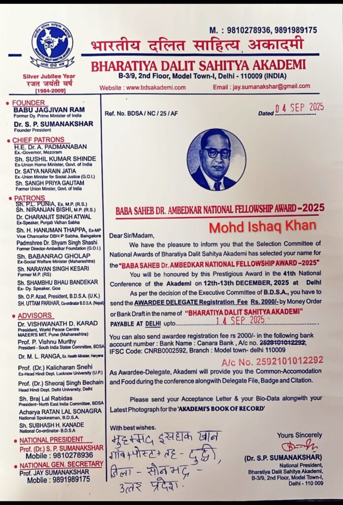 दुद्धी सोनभद्र नगर पंचायत वार्ड 4 के रहने वाले खोजी पत्रकारिता के लिए जानें जानें वाले कवि साहित्यकार, समाजसेवी और पर्यावरण चिंतक मुहम्मद इसहाक खान को भारतीय दलित साहित्य अकादमी की ओर से डॉक्टर भीमराव अंबेडकर राष्ट्रीय फेलोशिप 2025 से सम्मानित करने की घोषणा की गई है। यह प्रतिष्ठित सम्मान उन्हें गवर्नमेंट मीडिया में रहते हुए दलित आदिवासी बाहुल्य क्षेत्र में स्वास्थ्य,शिक्षा, पर्यावरण चिंतन और आपसी सौहार्द के साथ साथ जन जागरूकता और राष्ट्र निर्माण के क्षेत्र में उचित मार्गदर्शन के लिए प्रदान किया जाएगा । सम्मान समारोह 12 और 13 दिसंबर को दिल्ली में आयोजित किया जाएगा । यह प्रतिष्ठित सम्मान दलित और पिछडा पूर्वांचल क्षेत्र से मुहम्मद इसहाक खान एक आदर्श व्यक्तित्व के रूप में चयन किए गए हैं जो विशेष रूप से “ग्राम गौरव संस्कृति संस्कारी समूह ट्रस्ट के माध्यम से समाज के वंचित दलित पिछड़ो साथ ही नदियों, विशालकाय चट्टानों,पहाड़ों , प्राकृतिक भूभागों के संदर्भ मे पर्यावरण को लेकर अपनी चिंता जाहिर करते रहे हैं। इन्होंने अपने कार्यक्रमों के जरिए सामुदायिक सहयोग और सद्भाव के माध्यम से सामाजिक एकता और सद्भावना की जिम्मेदारी निभाने की बखूबी कोशिश की है। दुद्धी परिक्षेत्र की साहित्यिक अभिरुचि एवं लेखकीय उसरता को दूर करने की कड़ी में पद्मश्री डॉ मोहम्मद हनीफ खान शास्त्री और डॉ लवकुश प्रजापति अन्य के बाद क्षेत्र की यह अगली कामयाबी है। इस सम्मान हेतु जब अकादमी की ओर से जानकारी जुटाई जा रही थी तब क्षेत्र के वरिष्ठ चिकित्सक और जाने-माने समाजसेवी,व साहित्यकार डॉ लवकुश प्रजापति ने पुरजोर समर्थन किया। परिणाम स्वरूप इसहाक खान चयनित किए गए।