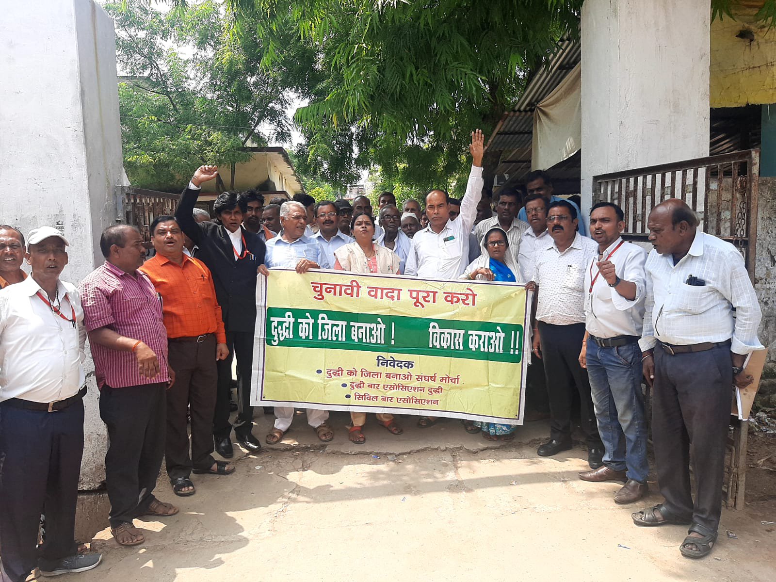 दुद्धी सोनभद्र। दुद्धी को जिला बनाए जाने की मांग को लेकर संघर्ष समिति के सदस्यों और अधिवक्ताओं ने न्यायिक कार्य से विरत रहकर कचहरी गेट पर प्रदर्शन किया और नारेबाजी कीl दुद्धी बार संघ के पूर्व अध्यक्ष कुलभूषण पांडे ने कहा कि दुद्धी को से जिला बनाए जाने की मांग को लेकर आंदोलन संघर्ष समिति के तत्वाधान में किया जा रहा है उसके बावजूद सरकार प्रदेश की आंख मूंदकर पड़ी हुई है।