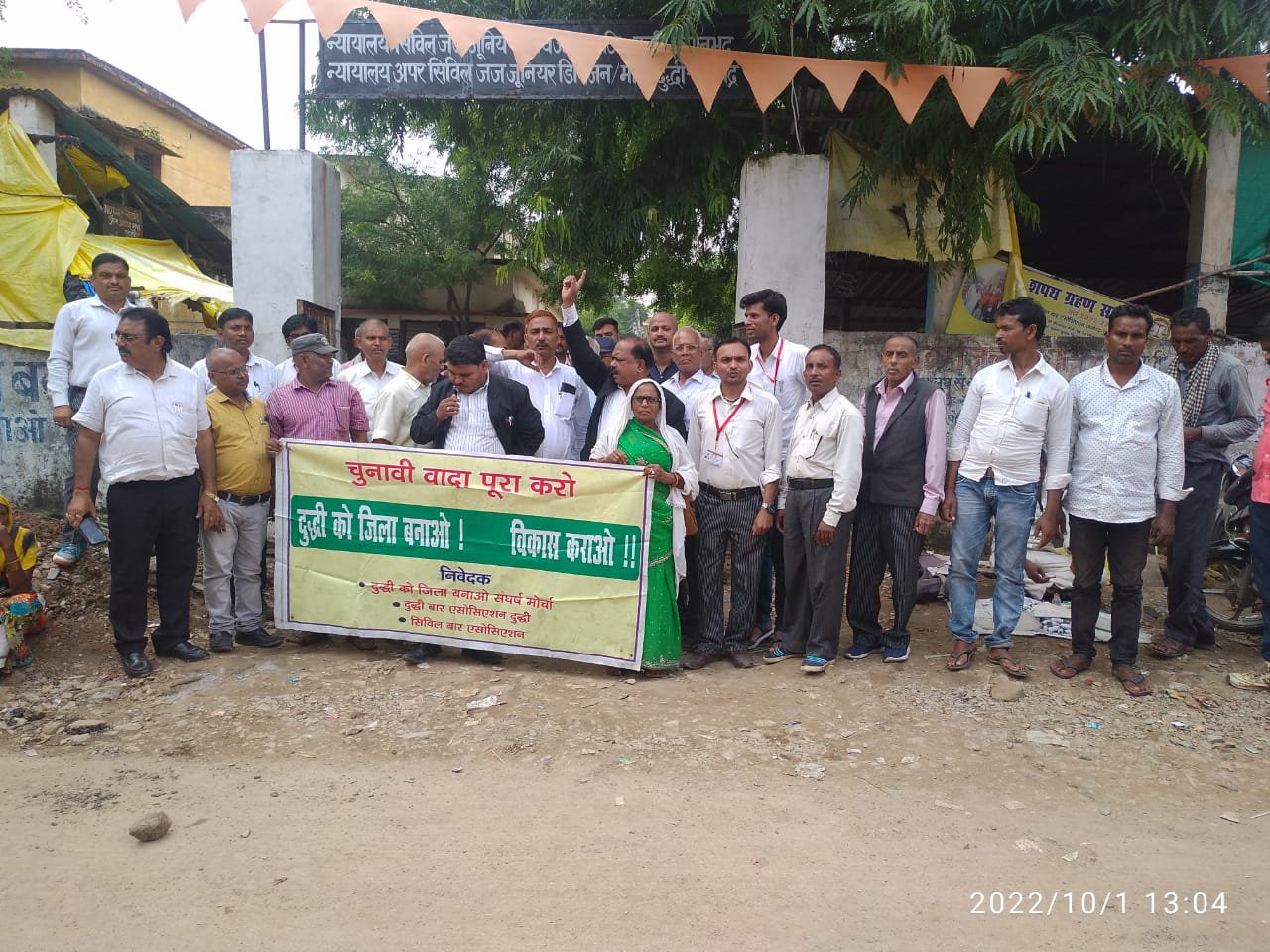 सिविल बार संघ के अध्यक्ष एवं संघर्ष समिति के महासचिव प्रभु सिंह कुशवाहा ने कहा कि दुद्धी को से जिला बनाए जाने की मांग को लेकर आंदोलन संघर्ष समिति के तत्वाधान में किया जा रहा है उसके बावजूद सरकार प्रदेश की आंख मूंदकर पड़ी हुई हैl. कहा कि सरकार ने पिछले चुनाव में वादा किया था लेकिन दूसरी बार सरकार बनने के बाद में सरकार अपनी वादा भूल गई जिससे लोगों में नाराजगी धीरे-धीरे बढ़ती जा रही हैl कहा कि अगर शीघ्र ही सरकार जिला बनाए जाने की मांग को लेकर गंभीर नहीं हुई तो आने वाले समय में संघर्ष समिति अपना आंदोलन तेज कर बड़े आंदोलन के लिए बाध्य होगाl दुद्धी बार संघ के पूर्वअध्यक्ष ने कहा रामपाल जौहरी कि जिले से संबंधित कार्य के लिए लोगों को डेढ़ सौ किलोमीटर का सफर करना पड़ता है अगर काम नहीं हुआ तो वापस आना पड़ता है आने जाने को लेकर 300 किलोमीटर हो जाता है उसके बाद भी सरकार आम जनता की समस्याओं के प्रति गंभीर नहीं दिख रही है। सिविल बार संघ के पूर्व सचिव राम जी पांडे ने कहा की हाल में हुए विधानसभा चुनाव में प्रदेश के मुख्यमंत्री योगी आदित्यनाथ दुद्धी आए हुए थे ।उन्होंने आम जनता से कहा था दुद्धी विधानसभा क्षेत्र के विधायक को जीत आओगे ना तो भीड़ भरी आम जनता ने कहा कि प्रत्याशी को जिताएंगे और प्रत्याशी जीत भी गए विधानसभा पहुंच भी गए सरकार भी बन गई उसके बावजूद भी जिला मुख्यालय के नाम पर मुख्यमंत्री के स्वर कड़े केकड़े ही हैंl उन्होंने कहा कि शीघ्र ही जिला से संबंधित मांग को लेकर भारत के प्रधानमंत्री से मुलाकात कर अपनी समस्याएं रखेंगेl पूर्व अध्यक्ष प्रेमचंद यादवने कहा कि क्षेत्र के आदिवासी गरीब लोगों को न्यायालय या जिलाधिकारी से संबंधित मुकदमों के पैरवी के लिए जिला मुख्यालय जाना पड़ता है सुबह जाता है फिर रात में लोग लौट पाते हैं यहां के न्यायालय से पिपरी अनपरा थानों के आईपीसी के मुकदमे भी जिला मुख्यालय पर सुनाई होती है जो यहां के जनता के लिए बहुत बड़ा नाइंसाफी है उन्होंने कहा कि अगर सारे समस्याओं का समाधान शीघ्र नहीं होता है तो संघर्ष समिति के लोग और अधिवक्ता आंदोलन के लिए मुखर होंगे जिसके जिम्मेदारी शासन की होगीl इस मौके पर विजय सिंह राम जी पांडे अरुणोदय जौहरी छोटे लाल गुप्त उदय लाल मौर्या पीयूष अग्रहरी आशीष गुप्ता राकेश रेनू अग्रहरी राकेश कुमार अग्रहरी मनोज आजाद जीवन राम चंद्रवंशी प्रेमचंद गुप्ता संतोष कुमार टंडन सन्नो बानो रेनू कुमारी शकुंतला अमरावती देवी सहित काफी संख्या में लोग मौजूद रहे।