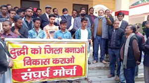 जिस पर उप जिलाधिकारी रमेश कुमार ने कहा कि आपकी मांग को सरकार तक पहुंचाया जाएगा तथ्यों के साथ संपूर्ण कागजात उपलब्ध कराएं जिससे जिला बनाओ मोर्चा की मनसा से सरकार को तथ्यपरक रूप से प्रस्तुत किया जा सके। जिलाधिकारी दुद्धी के आश्वासन के बाद मोर्चा के लोगों द्वारा जमकर नारेबाजी गर्जना के साथ किया गया, जिससे आसपास का वातावरण जोश पूर्ण हो गया और आसपास कौतूहल का विषय देखा गया। लंबा संघर्ष मोर्चा का जिला बनाओ को लेकर विगत दशकों से चला आ रहा है, जो गांव गांव आंदोलन की शक्ल ले रहा है। जिसके गंभीरता को नजरअंदाज करना शासन को कभी भी महंगा पड़ सकता है, चुनाव में ऐसे लोगों के बहिष्कार की भी बात जोर पकड़ने लगी है।