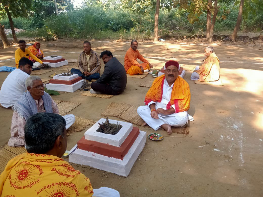 व्यास पीठ पर विराजित शिवकुमार, हुलास प्रसाद एवं विजय कुमार के द्वारा संगीतमयी कलश पूजन वंदना, गायत्री माता, परम पूज्य गुरुदेव वंदनीय माता का आह्वान के बीच गायत्री महामंत्र , महामृत्युंजय मंत्र एवं परम पूज्य गुरुदेव एवं वंदनीय माता की आहुति वैदिक मंत्रोच्चारण के सानिध्य में यज्ञ कुंड पर दीपप्रज्ज्वलन उपरानl त विश्वकल्याण के भावना से हवन कराई गई l कलावा, अक्षत , रोली, पुष्प, धूप दीप नैवेद्य के सानिध्य में चारों दिशाओं में अक्षत पुष्प की वर्षा कर कलश के अमृत रूपी जल से पवित्रीकरण कर अभिसिंचन भक्तजनों पर किया गया l एक दूसरे को रोरी माथे पर लगाते हुए हाथों पर कलाई गायत्री मंत्र उच्चारण के बीच बांधी गई l हवन समिधा का ललाट पर तिलक व घी से चेहरे एवं हृदय पर अग्नि की तपिश से मन मस्तिष्क एवं शरीर को पवित्र किया गया।