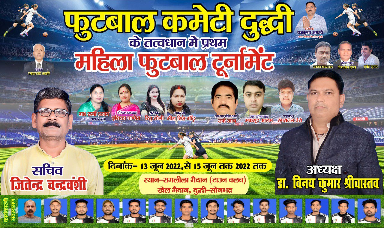 दुद्धी सोनभद्र खेल मैदान टीसीडी ग्राउंड पर प्रादेशिक महिला फुटबॉल टूर्नामेंट का आयोजन 13 जून दिन सोमवार से प्रारंभ होगा, जो 15 जून तक चलेगा। प्रथम दिवस सायं कालीन 4:00 बजे से दो मैच खेला जाएगा एवं दिनांक 14 जून दिन मंगलवार को प्रथम पाली में प्रातः 7:00 बजे से 8:30 बजे तक मैच खेला जाएगा व दूसरा मैच सायं कालीन 4:00 बजे से 5:30 बजे तक खेला जाएगा। 15 जून दिन बुधवार को सायं कालीन मैंच 4:00 बजे से फाइनल मैच खेला जाएगा, तत्पश्चात विजेता उपविजेता टीम को पुरस्कृत आयोजक मंडल द्वारा किया जाएगा।