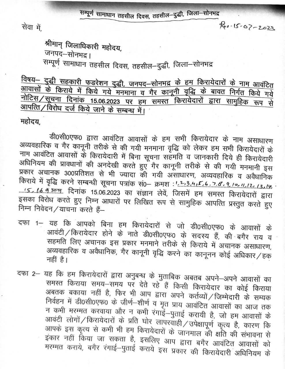 दुद्धी सरकारी फेडरेशन में वर्षों से रह रहें लोगों का किराया वृद्धि को लेकर आक्रोश डी सी एफ डायरेक्टर ने कहा मामूली किराया वृद्धि हैं। दुद्धी सोनभद्र संपूर्ण समाधान दिवस में जिलाधिकारी महोदय के नाम डीसीएफ कॉलोनी जो दुद्धी सहकारी फेडरेशन द्वारा गवर्न होता है में वर्षों से रह रहे किरायेदारों का किराया असाधारण एवं व्यवहारिक वृद्धि का आरोप लगाते हुए किराएदार दुद्धी सहकारी फेडरेशन द्वारा जारी नोटिस से आक्रोशित होकर संपूर्ण समाधान दिवस में शिकायती प्रार्थना पत्र दिया। शिकायती प्रार्थना पत्र में आरोप लगाया गया है कि डीसीएफ के आवासों के आवंटित किरायेदारों से बिना सहमति के असाधारण किराया वृद्धि का नोटिस भेजा गया है जो गैरकानूनी हैं l शिकायतकर्ता कुलभूषण पांडेय एडवोकेट, पूर्व मंत्री विजय सिंह गौड़,चमेली देवी, भगवानदास, मोहम्मद अजीज, प्रेम सागर पांडेय, सुभाष गुप्ता, नागेंद्र श्रीवास्तव, अजय कुमार श्यामा, त्रिपुरारी यादव, वैशाली तिवारी, रजनीश पांडेय, पुष्पा पांडेय, उमेश कुमार राघवेंद्र प्रताप भाटिया द्वारा उमेश कुमार, राकेश सिंह द्वारा उमेश कुमार, कमलेश तिवारी द्वारा भरत लाल, सीताराम द्वारा दिलीप कुमार, बजरंग लाल उपाध्याय द्वारा उमेश कुमार,कृष्ण कुमार सिंह पुत्र जगदीश, स्वर्गीय राजेश कुमार सिंह पत्नी सुनंदा देवी, भुल्लन सिंह आदि ने जिलाधिकारी से मांग किया है कि गैर कानूनी मनमाना ढंग से वृद्धि किराया को वापस लिया जाए, किरायेदारों से सहमति अनुसार पारित किरायादारी तय हों।