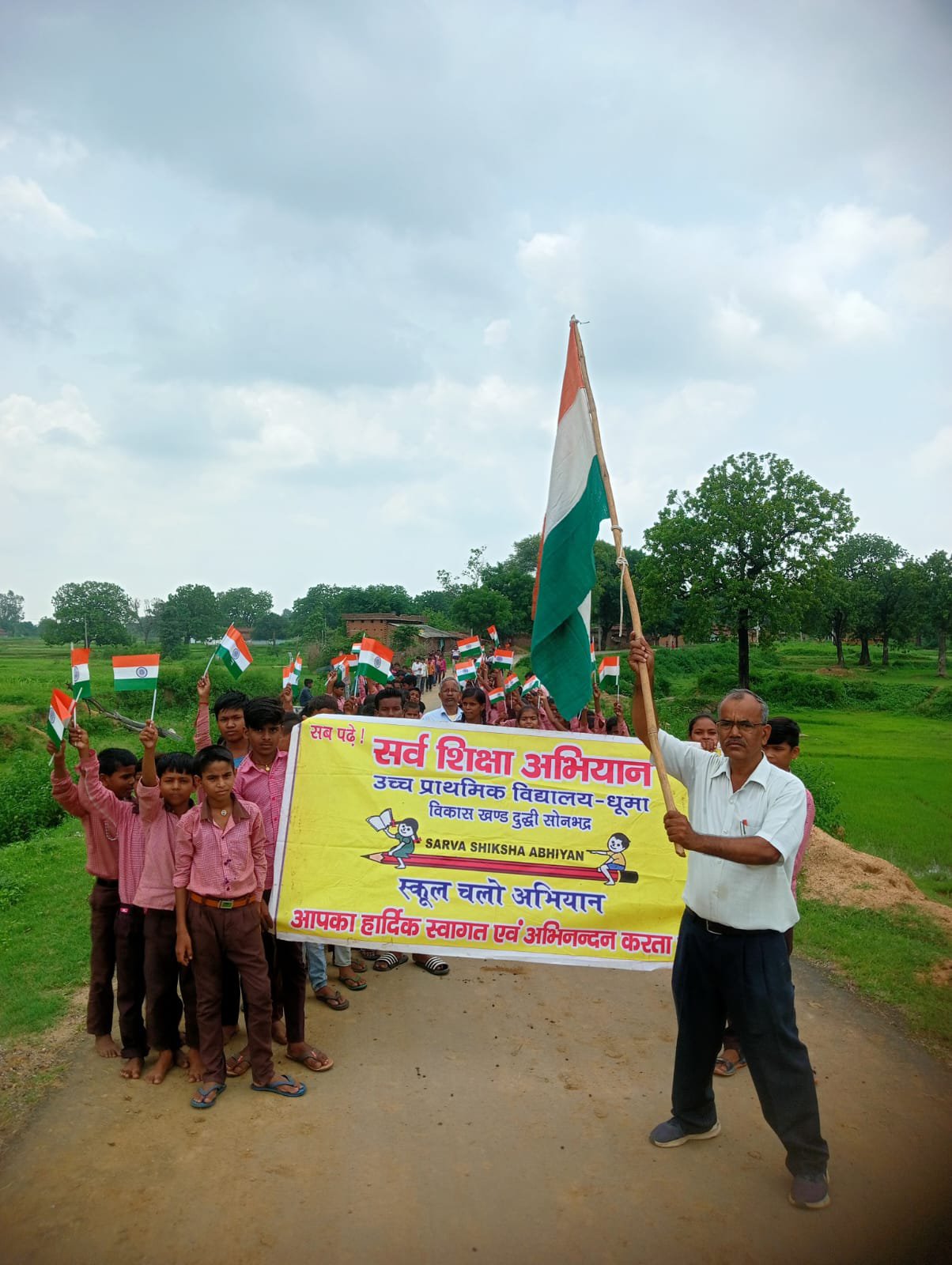 सोनभद्र। स्थानीय विंढमगंज थाना क्षेत्र अंतर्गत धूमा उच्च प्राथमिक विद्यालय की ओर से आजादी के अमृत महोत्सव के अंतर्गत मेरी माटी मेरा देश अभियान के तहत प्रधानाध्यापक अवधेश कनौजिया के नेतृत्व में विद्यालय के बच्चों एवं अध्यापकों ने अपने हाथों में तिरंगा लेकर के पूरे गांव के भ्रमण के दौरान भारत माता की जय वंदे मातरम तथा अन्य सुशोभित नारे लगाए गए यह यात्रा विद्यालय से निकलकर गांव भ्रमण करते हुए सुखड़l चौराहा तक पहुंचl फिर पुनः विद्यालय मे पहुंचकर समाप्त किया गया , प्रधानाध्यापक अवधेश कनौजिया ने बताया कि तिरंगा यात्रा देश भक्ति राष्ट्र गौरव और अपनेपन की भावना पैदा करने के लिए है मेरी माटी मेरा देश की अवधारणा देश की स्वतंत्रता और प्रगति यात्रा की याद दिलाते हुए भारत की मिट्टी के लिए जन-जन के हृदय में प्रेम प्रकाशित करने का कार्य करेगा यह कार्यक्रम 9 अगस्त से 15 अगस्त 2023 तक चलाया जा रहा है इस अवसर पर उपस्थित लोगों में अवधेश कनौजिया प्रधानाध्यापक, संतोष कुमार सहायक अध्यापक, दुष्यंत कुमार तिवारी अनुदेशक तथा अन्य छात्र-छात्राएं एवं अध्यापक इस तिरंगा यात्रा में शामिल रहे।