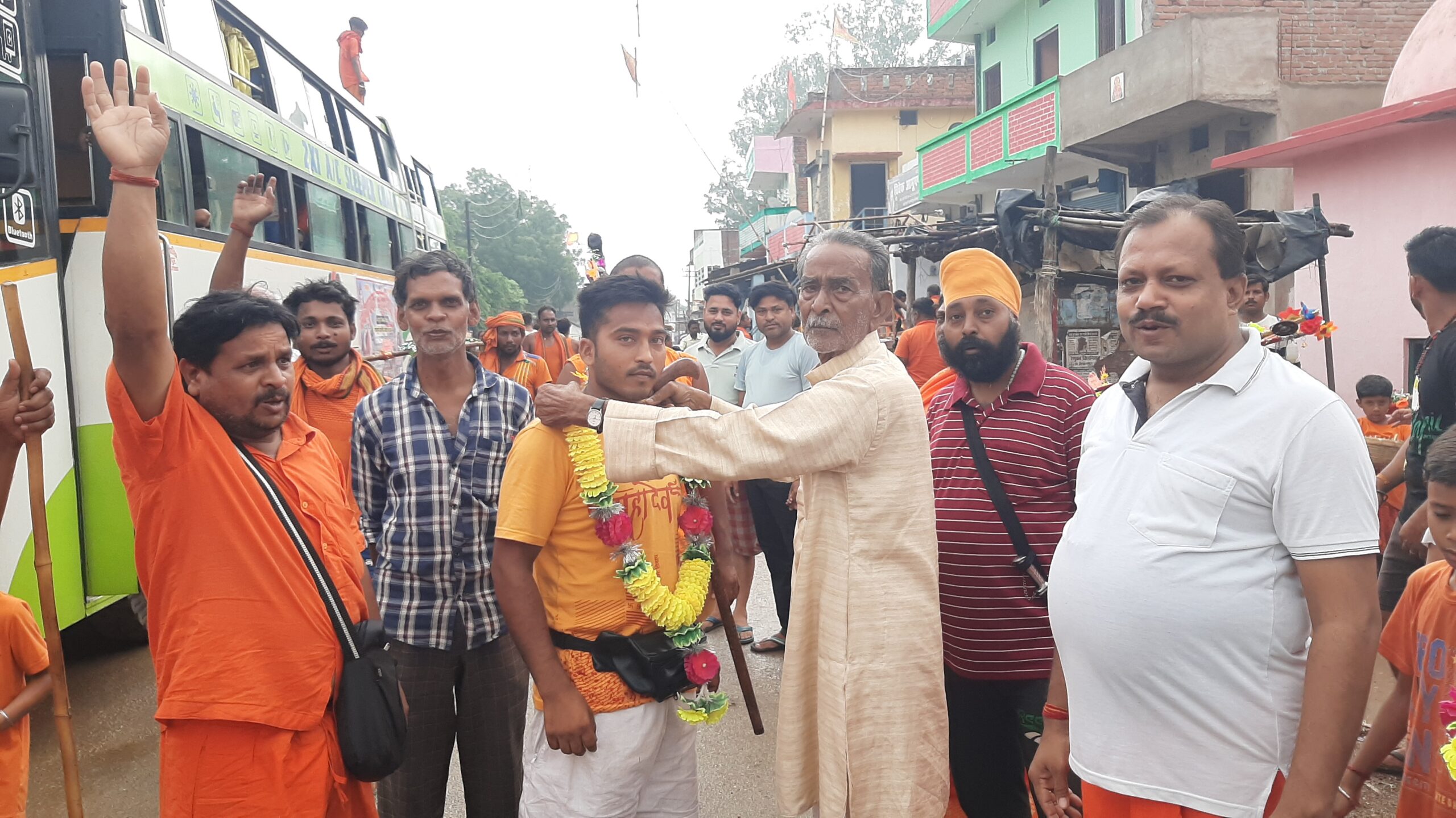 कावरियों का स्वागत गांव के सम्भ्रांत लोगो ने किया म्योरपुर क्षेत्र से एक मात्र डाक बम गए निशान्त अग्रहरी जिन्होंने मात्र 18 घण्टे मे सुल्तानगंज से 110 किलोमीटर की दूरी तय कर बाबा को जलाभिषेक किया था जिनका स्वागत गांव के लोगो ने माल्यार्पण कर किया निशान्त बम ने बताया कि मैं सोमवार को शाम 4 बजे जल उठाया था मंगलवार को सुबह 11 बजे