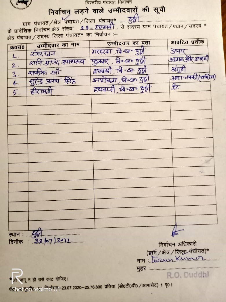 दुद्धी सोनभद्र विकासखंड अंतर्गत पंचायत रिक्त बी डी सी ग्राम हथवानी पद चुनाव हेतु आज क्षेत्र निर्वाचन अधिकारी आरो तरुण कुमार द्वारा घोषित 5 उम्मीदवारों को चुनाव चिन्ह आवंटित कर दिया। सूची अनुसार रंगराजन चेरो निवासी ग्राम गरदरवा विकासखंड दुद्धी सोनभद्र को “अनार ” का प्रतीक चुनाव चिन्ह आवंटित किया गया, वही शनि आनंद उपाध्याय निवासी फुलवार विकासखंड दुद्धी सोनभद्र को “अलाव और आदमी ” का प्रतीक चुनाव चिन्ह आवंटित किया गया, वहीं सफीक खान निवासी हथवानी विकासखंड दुद्धी सोनभद्र को अंगूठी का प्रतीक चुनाव चिन्ह आवंटित किया गया, सुरेंद्र प्रताप सिंह निवासीय झारोंकला विकासखंड दुद्धी सोनभद्र को “आटा चक्की (चकिया ) “चुनाव चिन्ह का प्रतिक आवंटित किया गया। वहीं हीरामती निवासीय हथवानी विकासखंड दुद्धी सोनभद्र को ईट का प्रतीक चुनाव चिन्ह आवंटित किया गया। इस आशय की जानकारी क्षेत्र निर्वाचन अधिकारी आरो तरुण कुमार ने दी है।