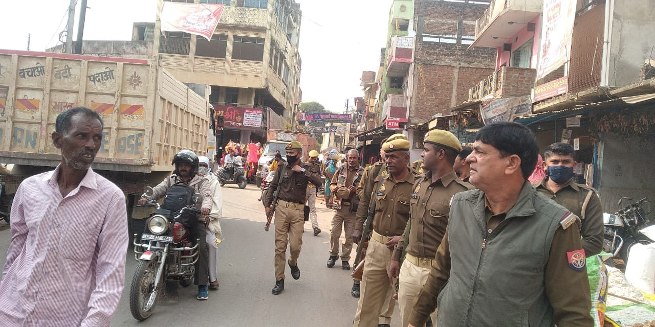 पीएसी के साथ कस्बा इंचार्ज ने किया नगर में भ्रमण।