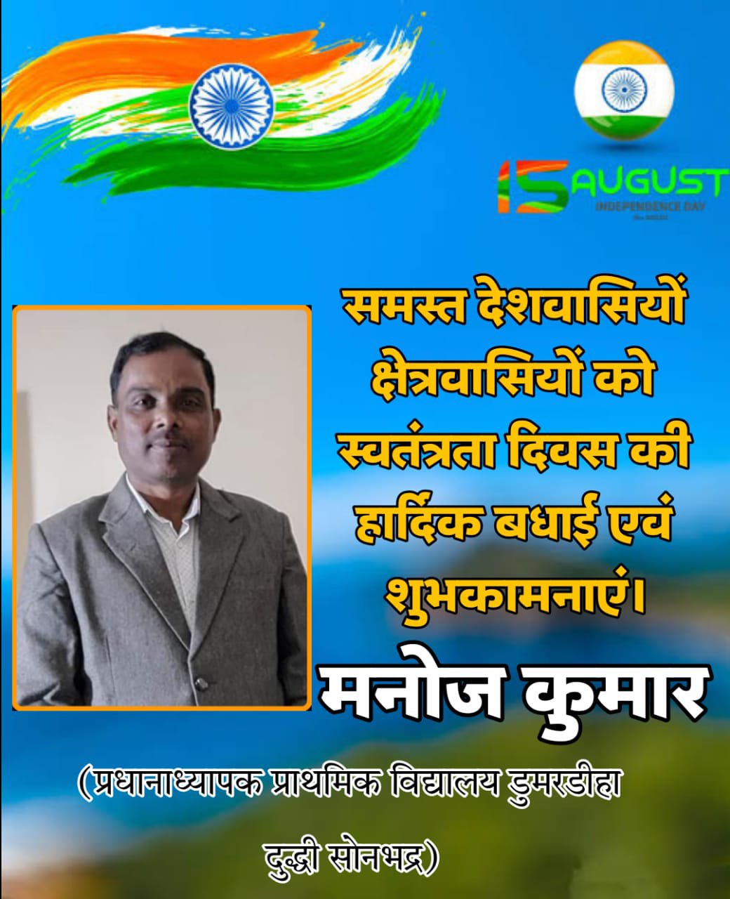 मनोज कुमार (प्रधानाध्यापक प्राथमिक विद्यालय डूमरडीहा दुद्धी सोनभद्र) के तरफ से समस्त देशवासियों क्षेत्रवासियों को हार्दिक बधाई एवं शुभकामनाएं।