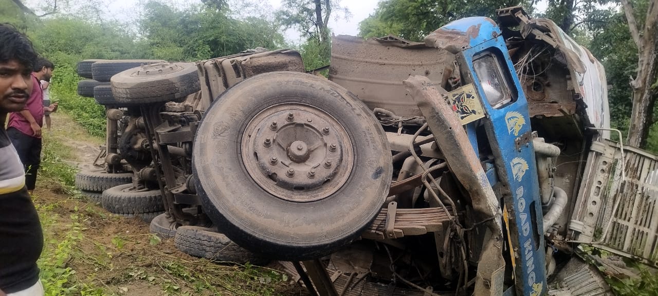 बालिका को टक्कर मार भाग रहा ट्रक मनबसा जंगल में पलटा, चालक-परिचालक फरार।