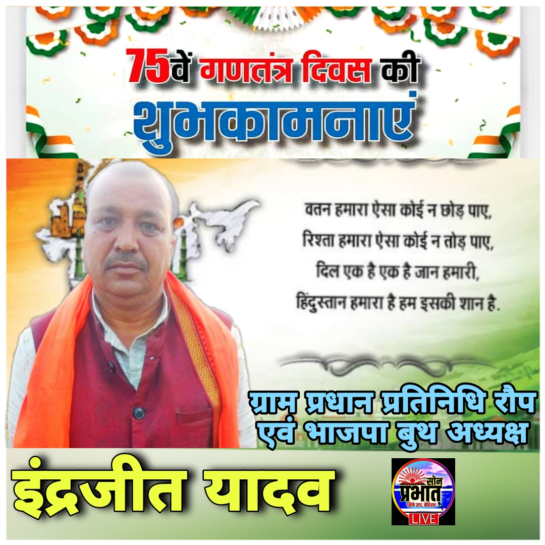 भाजपा बुथ अध्यक्ष एवं प्रधान प्रतिनिधि इंद्रजीत यादव ने गणतंत्र दिवस के अवसर पर बधाई व शुभकामनाएं ज्ञापित की है।