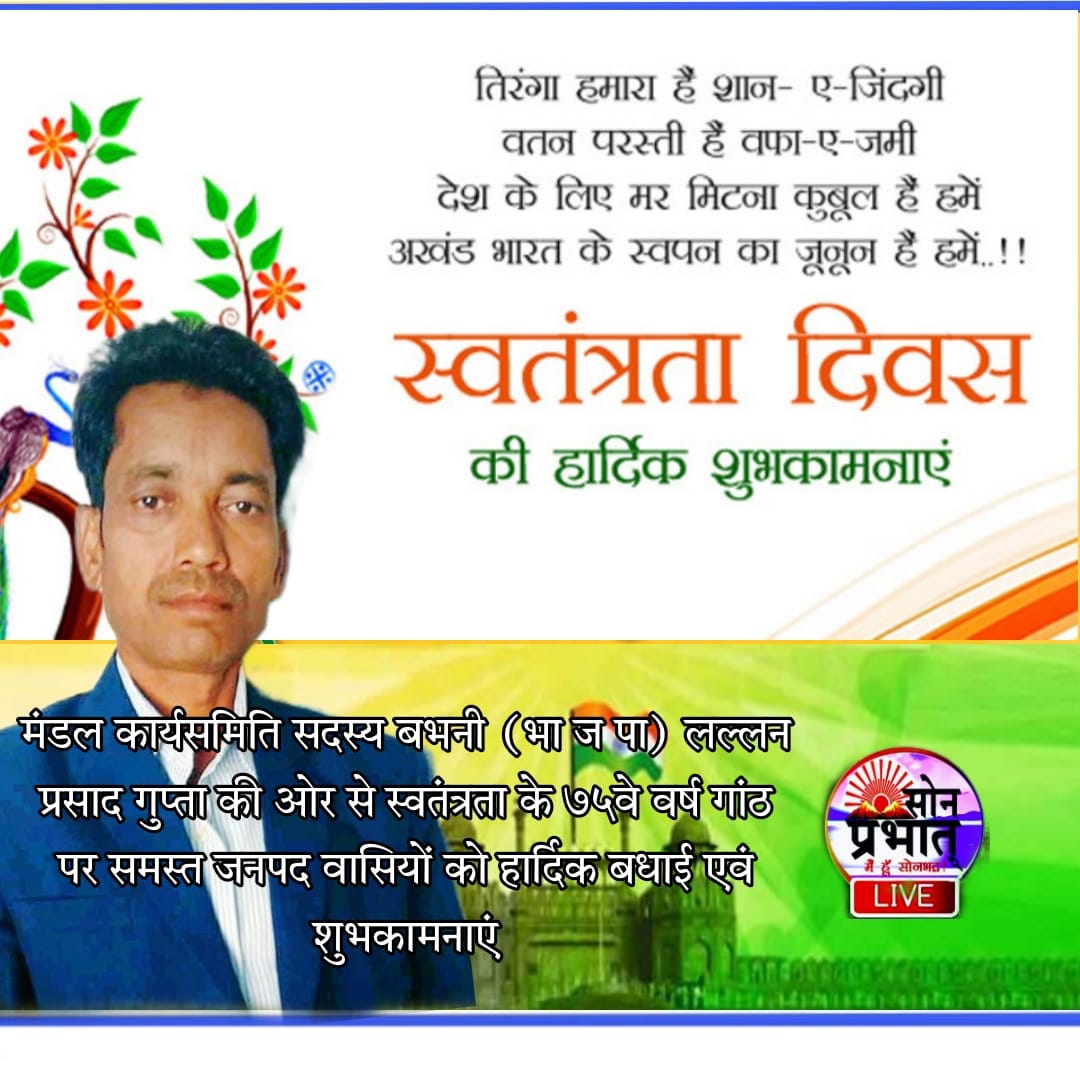 भाजपा मंडल कार्यसमिति सदस्य लल्लन प्रसाद गुप्ता ने समस्त जनपदवासियों व ग्रामवासियों को आजादी के 75वे वर्षगांठ की ढेरों शुभकामनाएं और बधाई ज्ञापित किया है।