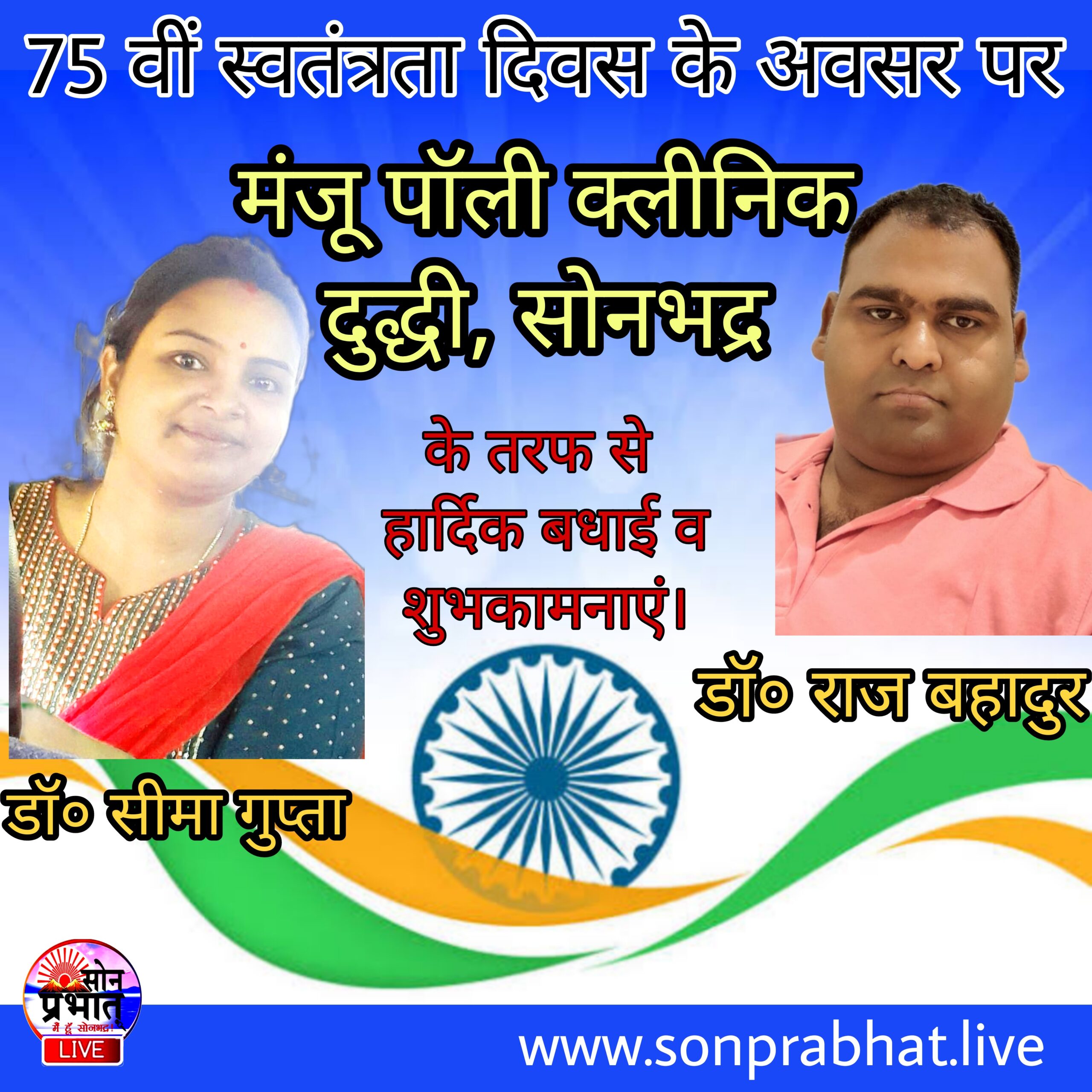 मंजू पॉली क्लीनिक दुद्धी के डॉक्टर राज बहादुर और डॉक्टर सीमा गुप्ता ने समस्त जनपदवासियों व ग्रामवासियों को आजादी के 75वे वर्षगांठ की ढेरों शुभकामनाएं और बधाई ज्ञापित किया है।