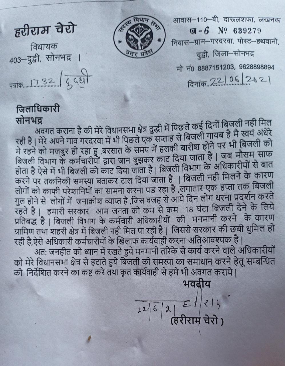 दुद्धी,सोनभद्र।विधानसभा क्षेत्र के लोकप्रिय विधायक हरिराम चेरो ने पत्रांक संख्या 1732 दिनांक 22 जून 2021 को जिला अधिकारी सोनभद्र को पत्र द्वारा विद्युत विभाग के द्वारा मनमाना कटौती की व्यथा को व्यक्त करते हुए कहा हैं कि मनमाना विद्युत कटौती एक-एक हफ्ते हल्की फुल्की बरसात पर कटौती की जा रही है विद्युत विभाग से इस संदर्भ में जब पूछा जाता है तो तकनीकी समस्या बताकर संबंधित अधिकारी पल्ला झाड़ लेते हैं, विधानसभा क्षेत्र दुद्धी में जनता को हफ्तों से बिजली की गंभीर समस्या से जूझना पड़ रहा है जिससे जनाक्रोश जनता में व्याप्त है, कार्य में लापरवाही बरतने वाले गैर जिम्मेदार निरंकुश विद्युत कर्मी को हटाए जाने और मनमाना विद्युत कटौती से जनता को निजात दिलाए जाने की कड़ा पत्र जनप्रतिनिधि लोकप्रिय विधायक हरिराम चेरो ने लिखा है l विद्युत कटौती से त्रस्त जनता द्वारा जनाक्रोश को लेकर मारपीट तक की नौबत हैं जिससे जनाक्रोश भड़क सकता है जिसे जनहित में रोका जाना आवश्यक होगा l