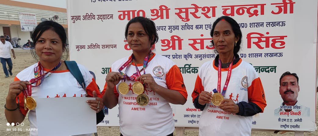 का आयोजन डा० भीमराव अंबेडकर स्टेडियम, जनपद- अमेठी में दिनांक 12 व 13 नवंबर 2022 को दो दिवसीय संपन्न हुआ। प्रदेश स्तरीय खेल के आयोजन में सोनभद्र से कुल 8 खिलाड़ियों ने प्रतिभाग किया जिसमें पांच महिलाएं व तीन पुरुषों ने भाग लिया। दुद्धी से आई०सी०डी०एस० विभाग की संगीता वर्मा, शिक्षा विभाग से वंदना कुशवाहा तथा आंगनवाड़ी कार्यकर्ता विद्यावती खरवार ने भाग लिया। इस प्रदेश स्तरीय खेल में आई०सी०डी०एस० विभाग की संगीता वर्मा ने 100 मीटर रेस में स्वर्ण पदक 80 मीटर हर्डल रेस में स्वर्ण पदक एवं 5000 मीटर वाॅक में स्वर्ण पदक प्राप्त कर कुल 3 स्वर्ण पदक अपने नाम करने पर आई०ए०एस० राकेश मिश्रा जी जिलाधिकारी अमेठी द्वारा मेडल पहनाकर सम्मानित किया गया।