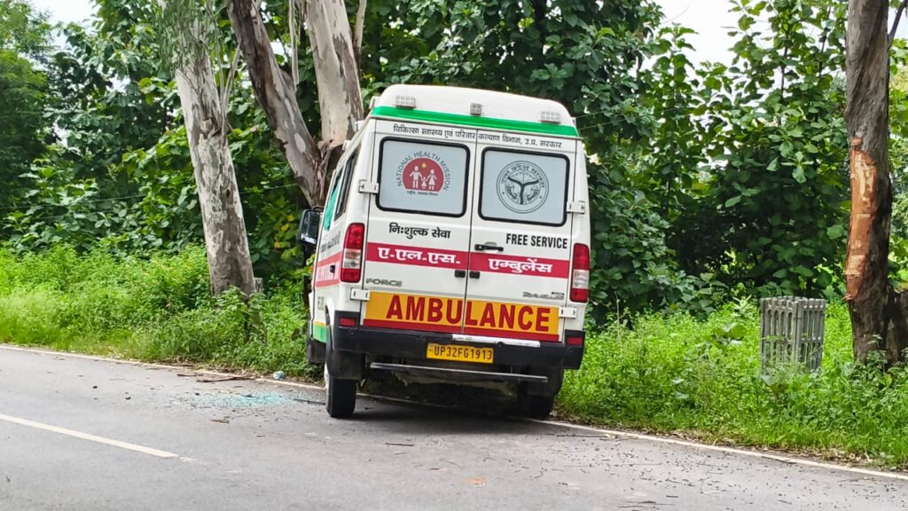 विकासखंड म्योरपुर के मुर्धवा-बीजपुर मार्ग पर ग्राम पंचायत खैराही के भैंसानाला से लगभग डेढ़ सौ मीटर पहले मुर्धवा मोड़ की ओर से आ रही एंबुलेंस नंबर UP 32 FG 1913 यूकेलिप्टस से पेड़ से जा टकराई। गनीमत यही रही की कोई बड़ा हादसा यहां नहीं हुआ। अगर इस मार्ग से भारी भरकम वाहन उस दौरान गुजर रहा होता तो बड़ी दुर्घटना होने की संभावना थी।