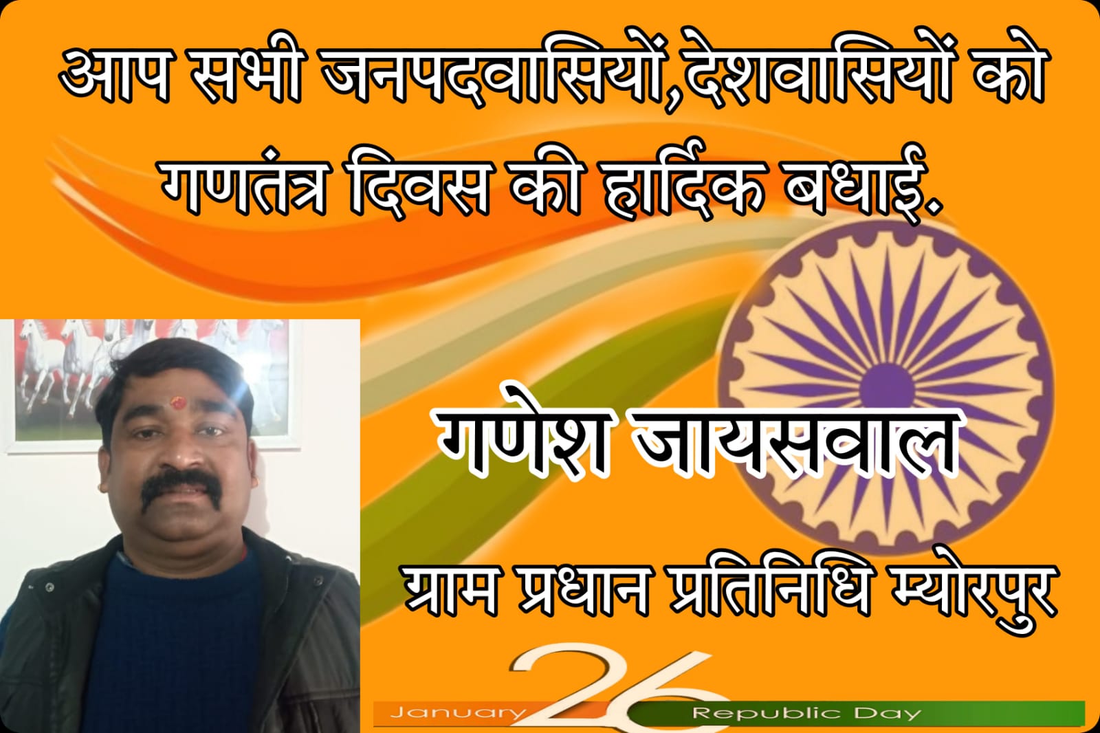 ग्राम प्रधान प्रतिनिधि म्योरपुर व भाजपा नेता गणेश जायसवाल ने गणतंत्र दिवस के अवसर पर बधाई व शुभकामनाएं ज्ञापित की।