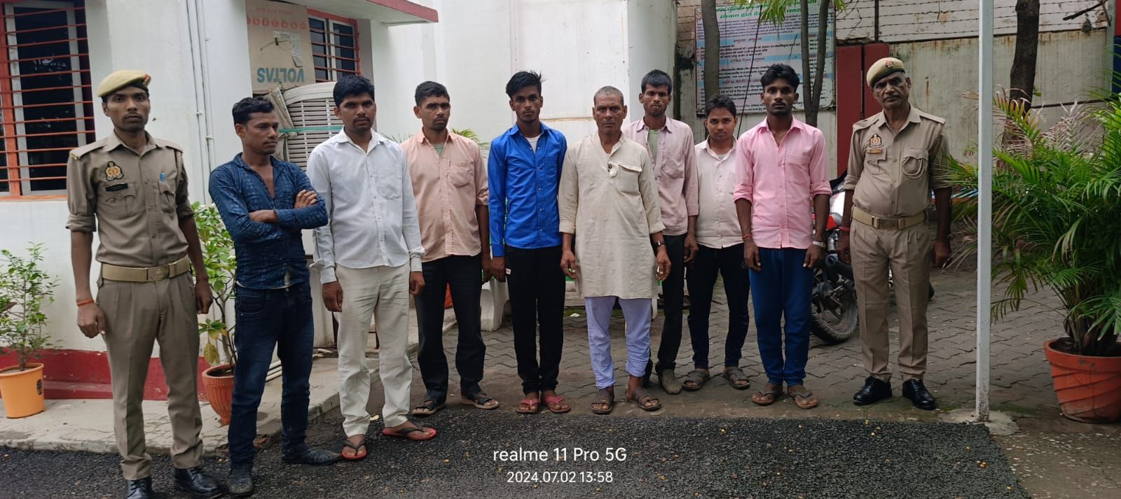 म्योरपुर थाना क्षेत्र अंतर्गत मंगलवार को विभिन्न मामलों में शांति व्यवस्था भंग करने को लेकर म्योरपुर पुलिस ने 08 अभियुक्तगणों अनिल कुमार पुत्र स्व0 जीतूराम उम्र 32 वर्ष निवासी ग्राम करहिया थाना म्योरपुर जनपद सोनभद्र ,रामसुरेश विश्वकर्मा पुत्र धनुषधारी उम्र 28 वर्ष निवासी ग्राम काचन थाना म्योरपुर जनपद सोनभद्र ,भगवानदास पुत्र लक्ष्मण उम्र 30 वर्ष ,चन्द्रिका प्रसाद पुत्र लक्ष्मण उम्र 45 वर्ष ,ओम प्रकाश पुत्र रामेश्वर उम्र 20 वर्ष ,सुरेश पुत्र गुट्टन उम्र 35 वर्ष ,शिवशंकर पुत्र रामेश्वर उम्र 18 वर्ष समस्त निवासीगण ग्राम सुपाचुआं थाना म्योरपुर जनपद सोनभद्र ,नंदलाल यादव पुत्र स्व0 राम अधार यादव उम्र 58 वर्ष निवासी ग्राम बराईडाड टोला चपरा थाना म्योरपुर जनपद सोनभद्र का अन्तर्गत धारा 170,126,135 BNSS में चालान कर माननीय न्यायालय के समक्ष प्रेषित किया गया।