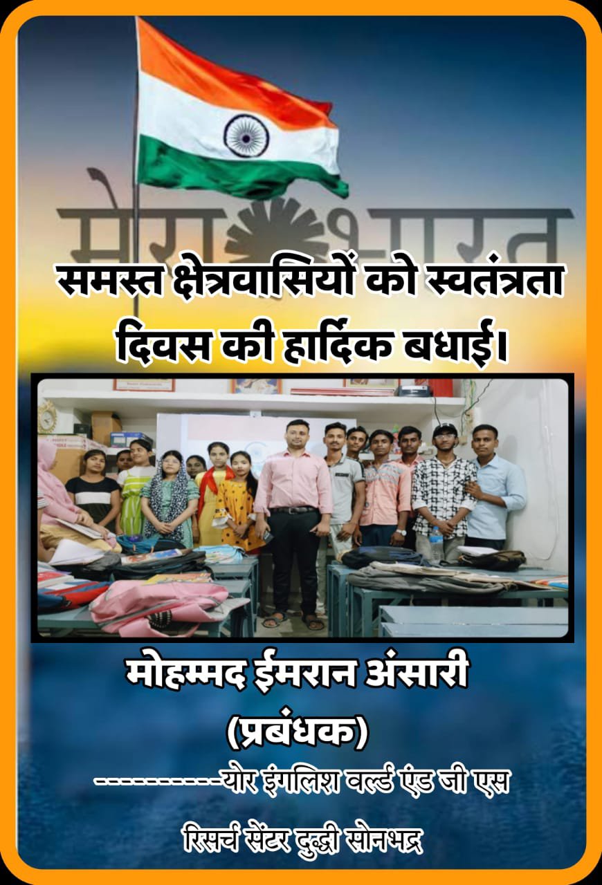 मोहम्मद इमरान अंसारी (प्रबंधक योर इंग्लिश वर्ल्ड एंड जी एस रिसर्च सेंटर दुद्धी) के तरफ से समस्त क्षेत्रवासियों को स्वतंत्रता दिवस की हार्दिक बधाई एवं शुभकामनाएं।