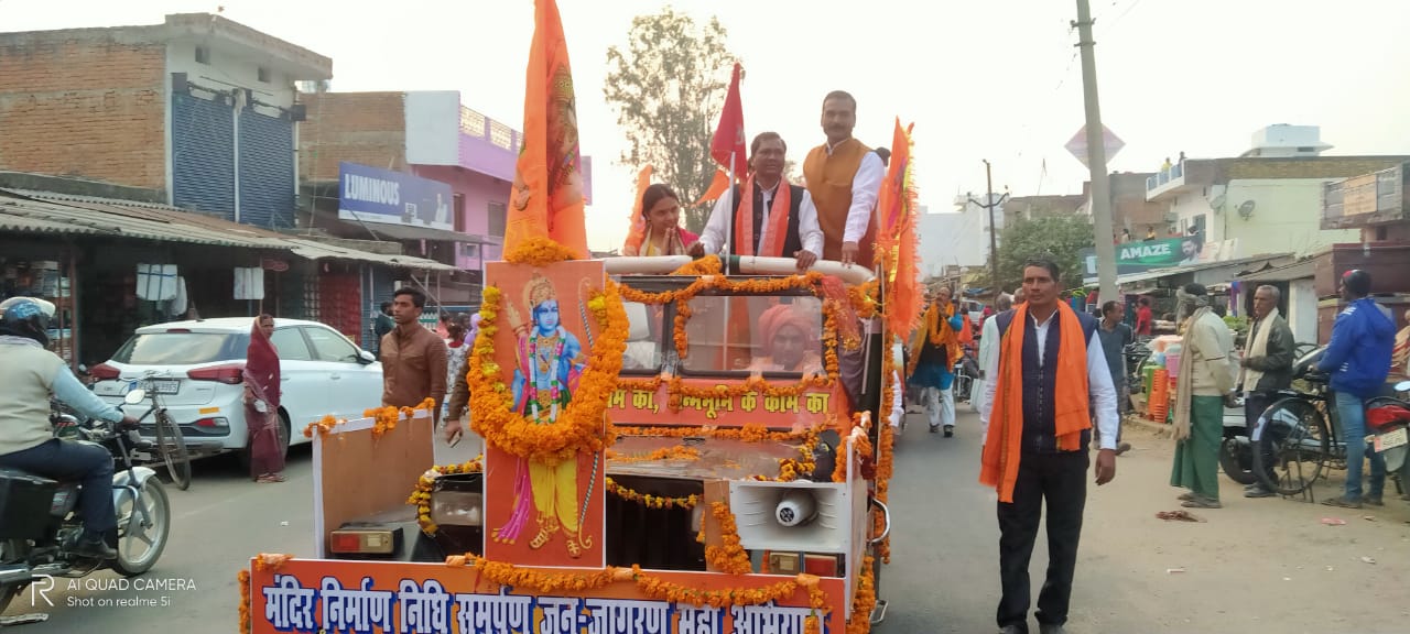 बभनी।स्थानीय थाना क्षेत्र अंतर्गत आज राम मंदिर निर्माण जन निधि समर्पण को लेकर जन जागरण की रथ यात्रा भव्य तरीके से निकाली गई। जिसमे बभनी थाने के समीप शिव मंदिर से चलकर ब्लाक मुख्यालय तक तीन किलोमीटर की रथयात्रा थी।