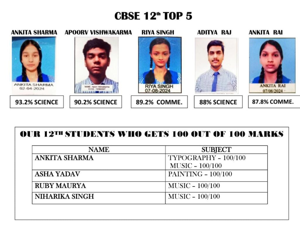 विद्यालय के प्रधानाचार्य आकाश सिंह ने बताया कि कक्षा 12वीं का परिणाम भी शत प्रतिशत रहा। विद्यालय में 134 छात्र बारहवीं की परीक्षा में शामिल हुए थे जिसमें सभी ने सफलता प्राप्त की हैl विद्यालय की छात्रा अंकिता शर्मा ने 93.2 प्रतिशत अंकों के साथ टॉप किया है। अपूर्व विश्वकर्मा ने 90.2 प्रतिशत, रिया सिंह ने 89.2, आदित्य राज ने 88 व अंकिता राय ने 87.8 प्रतिशत अंक प्राप्त किया है। विद्यालय की छात्रा अंकिता शर्मा ने दो विषयों में शत प्रतिशत अंक प्राप्त किये हैं। वही आशा यादव,रूबी मौर्य और निहारिका सिंह ने भी एक-एक विषयों में शत प्रतिशत अंक प्राप्त किए हैं।