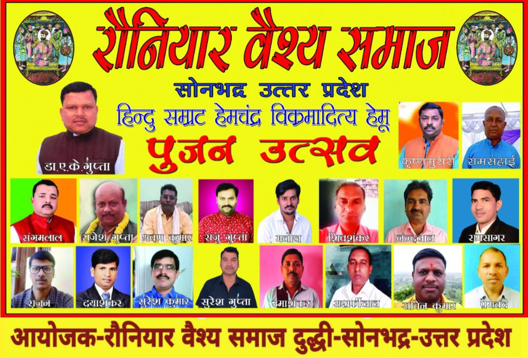 दुद्धी सोनभद्र हिंदू सम्राट हेमचंद्र विक्रमादित्य हेमू पूजन उत्सव का कार्यक्रम डीआर पैलेस दुद्धी में रौनियार वैश्य समाज के द्वारा संपादित किया जाएगा, जनपद सोनभद्र से समाज के विशिष्ट जनों का उपस्थिति होना सुनिश्चित है, कार्यक्रम का आयोजक रौनियार वैश्य समाज द्वारा किया जा रहा है।
