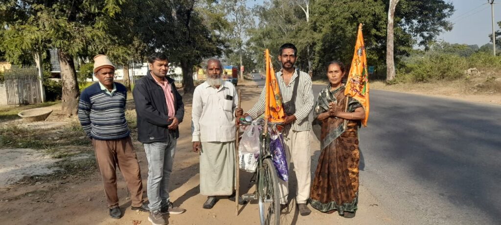 म्योरपुर विकासखंड के ग्राम पंचायत रासपहरी मे बीजपुर-मुर्धवा मार्ग पर आंध्र प्रदेश से पैदल यात्रा पर 1 दिसंबर 2025 को निकले तीन श्रद्धालु ने बताया कि हम लोग एक साइकिल के साथ पैदल ही निकले है।आंध्र प्रदेश के विशाखापट्टनम के 39 वर्षीय के.राजेश,63 वर्षीय नागेश्वर राव,58 वर्षीय महिला जी.लक्ष्मी ने बताया कि हम लोग पैदल ही विशाखापट्टनम से बनारस के काशी विश्वनाथ सहित अन्य मंदिरो मे एवं अयोध्या जाकर राम मंदिर मे दर्शन करेंगे।