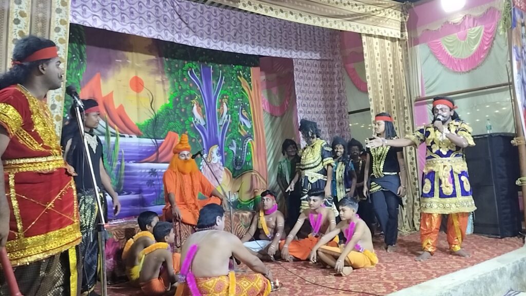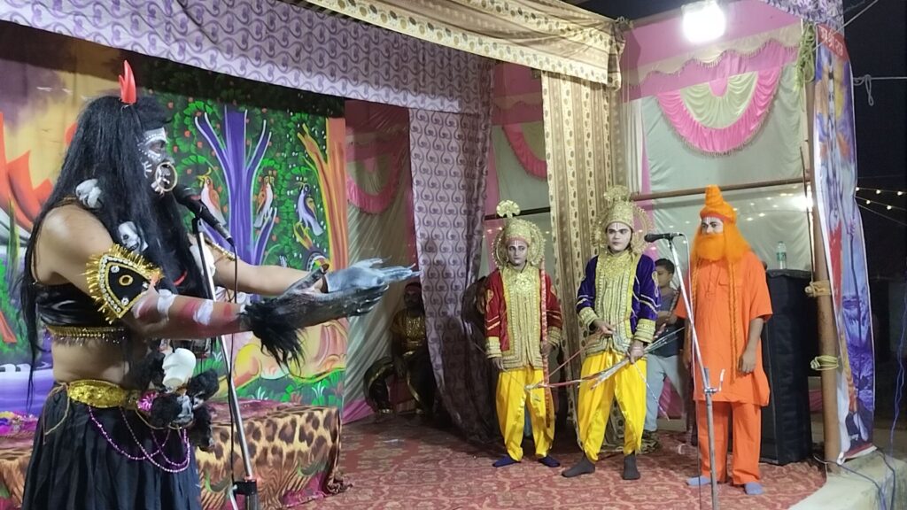 म्योरपुर रामलीला स्टेज पर चल रहे रामलीला मंचन के तीसरे दिन का लीला विश्वा मित्र के यज्ञ की रक्षा का प्रसंग खेला गया