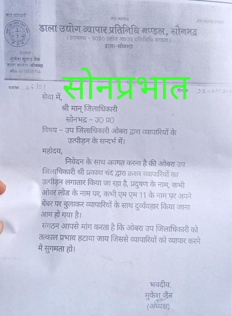 डाला । स्थानीय उद्योग व्यापार प्रतिनिधिमंडल अध्यक्ष मुकेश जैन ने व्यापारियों का उत्पीड़न ज्ञापन लेकर जिलाधिकारी सोनभद्र को सौंपा।